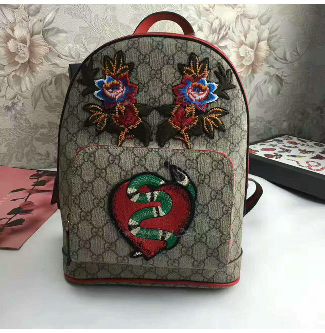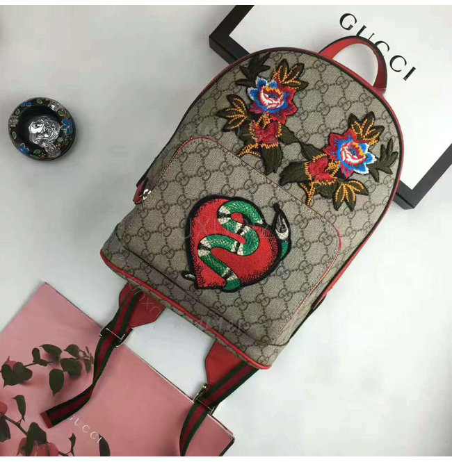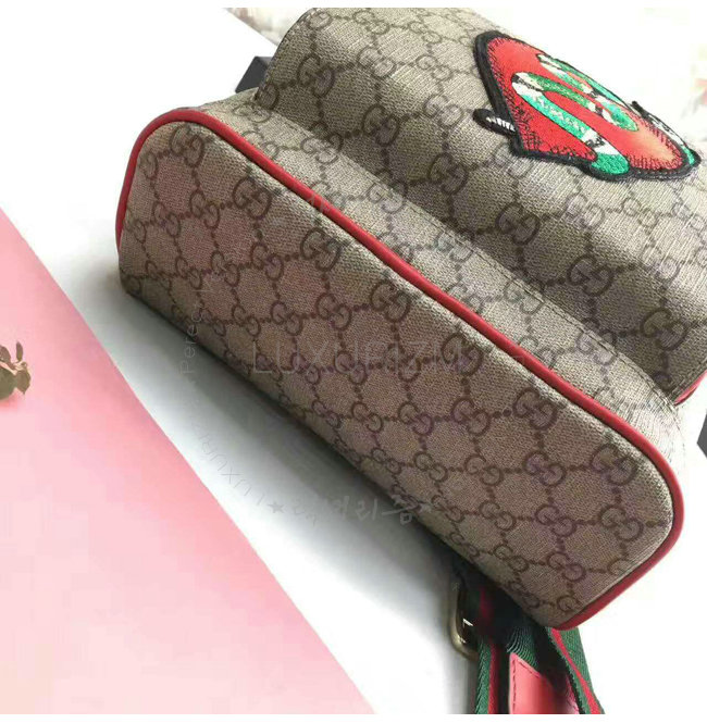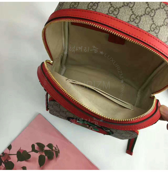 레드가죽 트리밍 및 자수 디테일의 백팩. 유연성을 높인 GG 수프림 캔버스 및