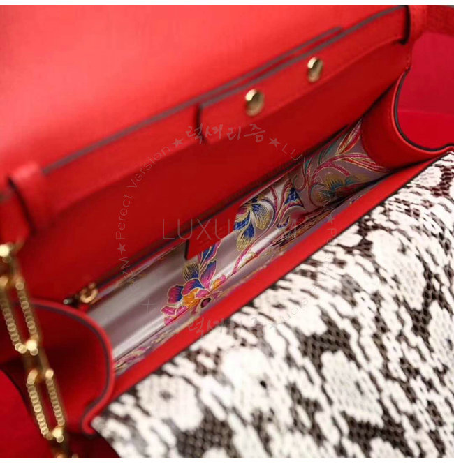 핸들.클래스프 잠금장치로 고정되는 플랩.하나의 플랩은 대조를 이루는 스네이크스킨으로 제작.