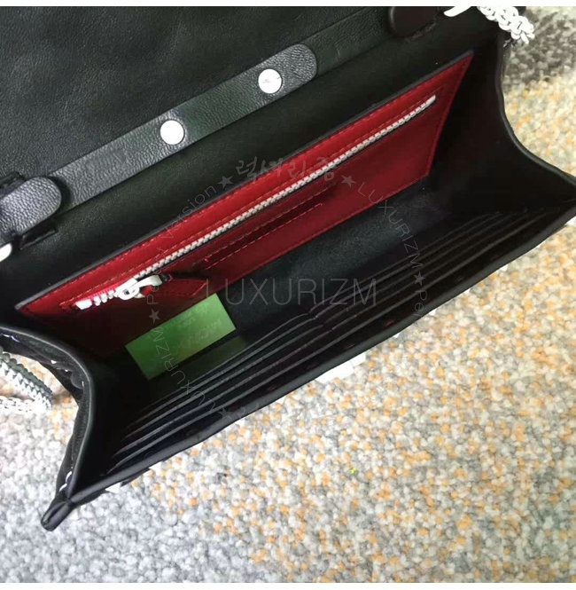 화이트 메탈 체인 나파 가죽 안감 처리. 내부: 레드 컬러 지퍼 포켓 여덟 개의 카드 슬롯.