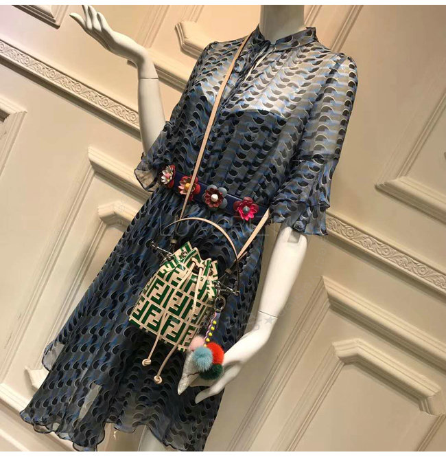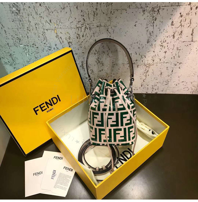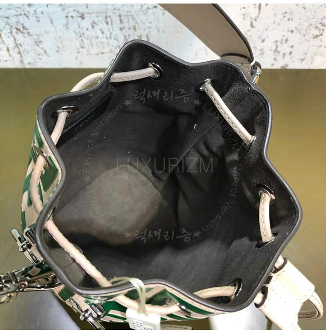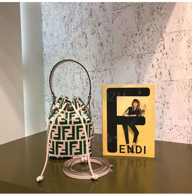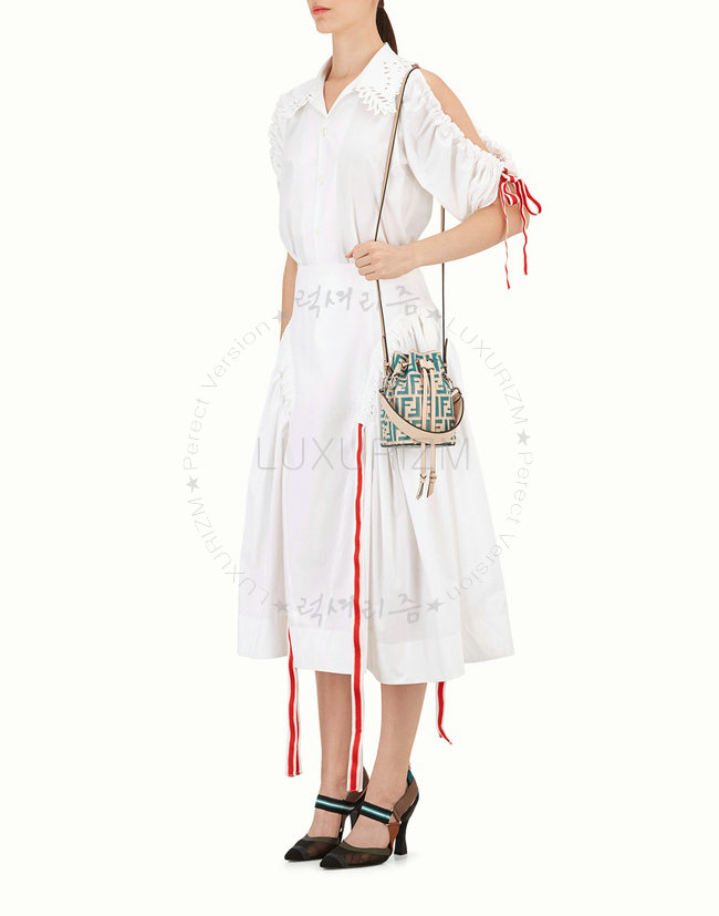 스몰 몽 트레죠르 버킷 백. 드로우스트링 잠금장치와 F is Fendi 로고 형태의 메탈 장식. 롱 길이