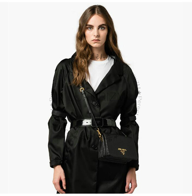 메탈 레터링 로고 자석 버튼 잠금?내부 수납공간 3개와 지퍼 포켓 1개 Prada 로고 라이닝.