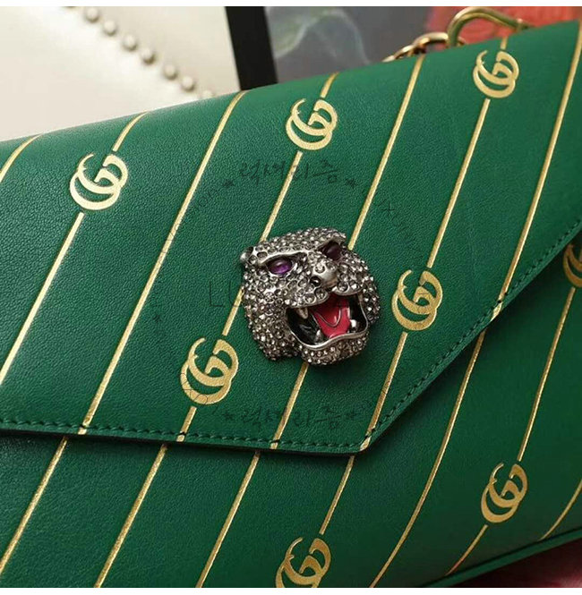 양쪽에 각각 골드 더블 G 스트라이프 프린트 그린 가죽 및 블랙 가죽 앤틱 골드 톤