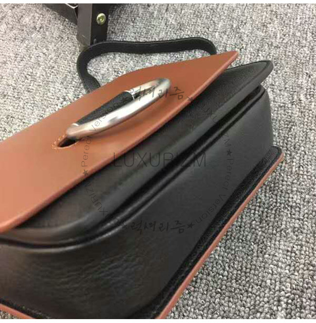 D링 여밈의 접이식 플랩 수작업으로 마감칠된 테두리 유광 금속 하드웨어.