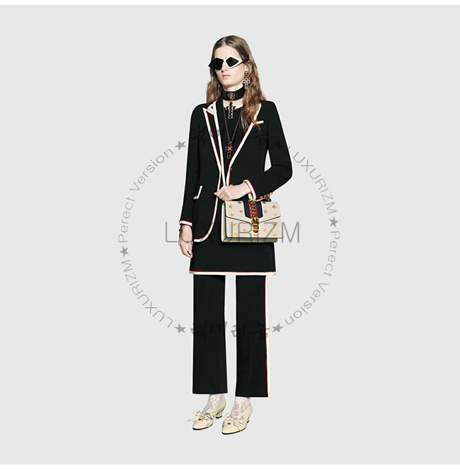 골드 메탈 체인 및 버클과 강렬한 대조를 이루는 웹(Web) 스트라이프 디테일.