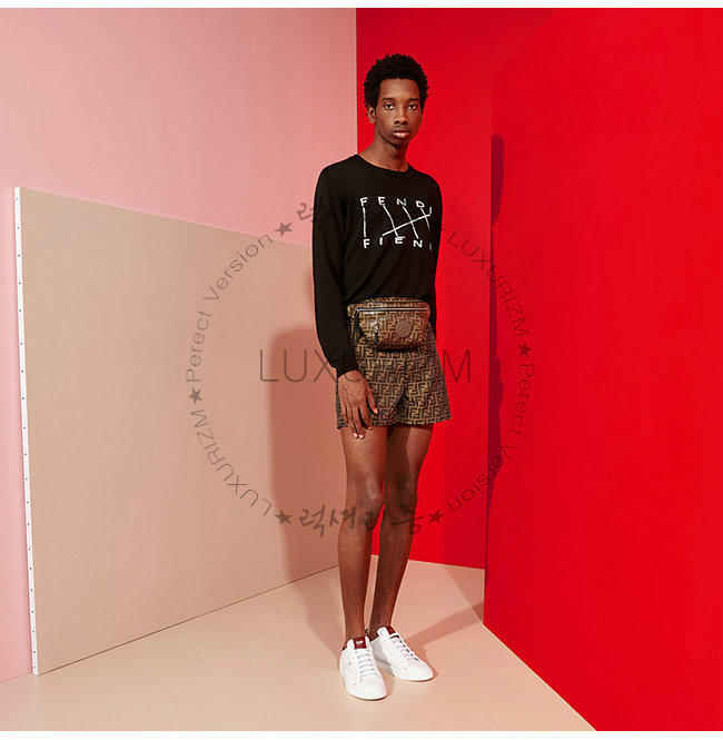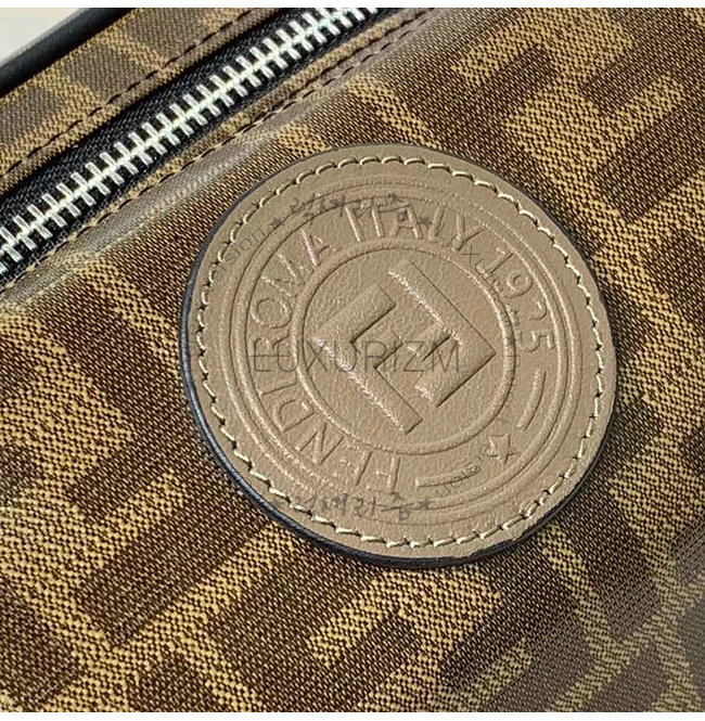 소재. 브라운 컬러의 FF 모티프. 가죽 펜디 스탬프 아플리케 장식.