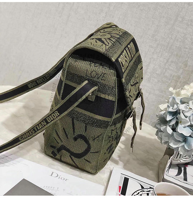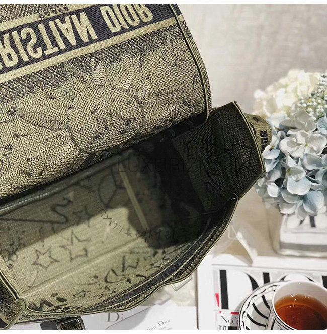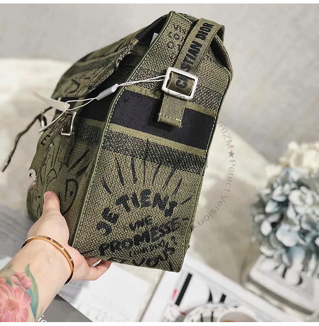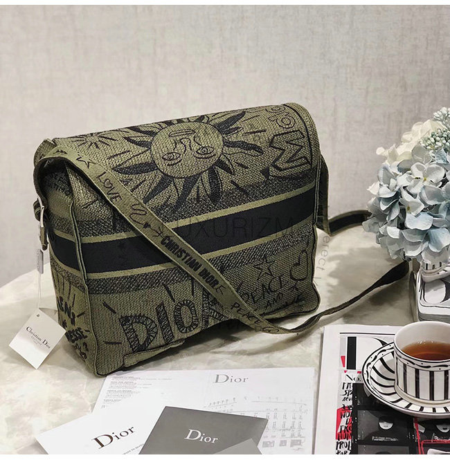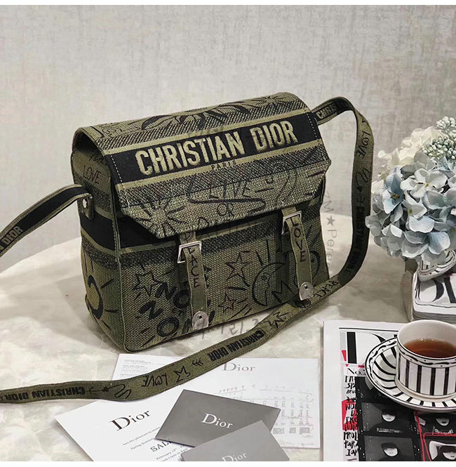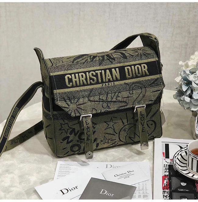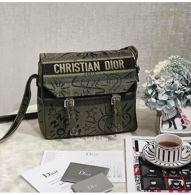 카키 자수 장식 패브릭 Diorcamp 메신저 백.
