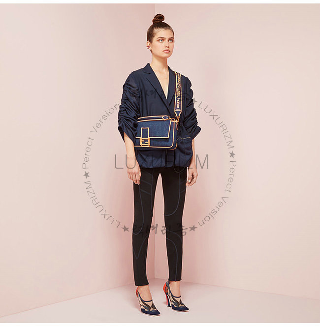 데님 소재. Fendi 라벨 자수로 맞춰진 롱 숄더 스트랩. 골드 피니싱 메탈웨어.