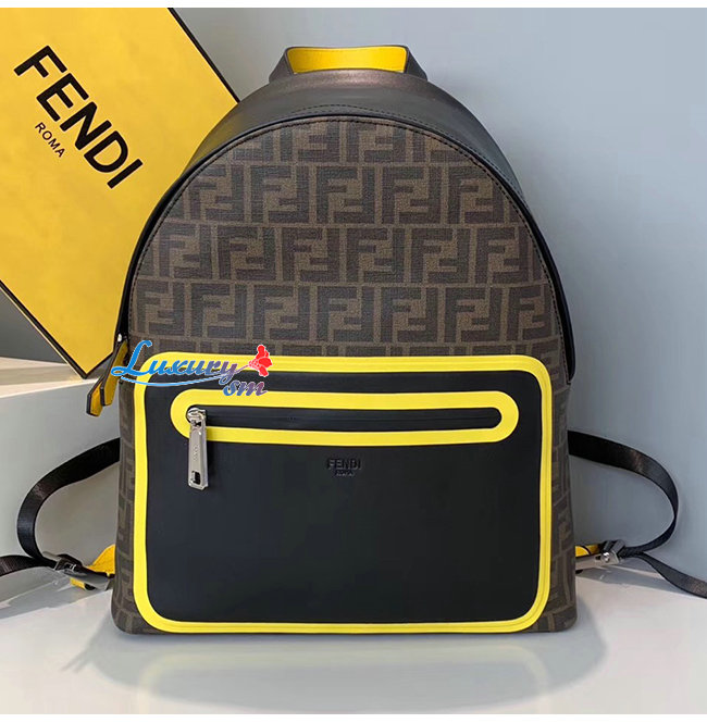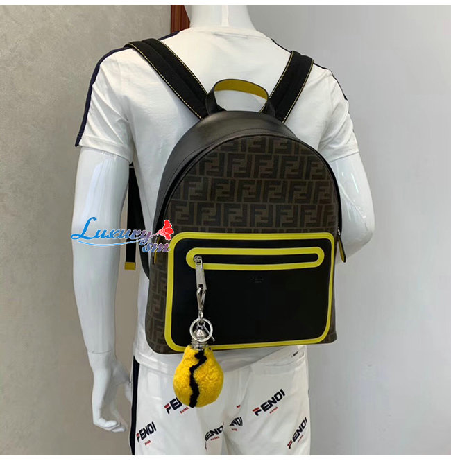 [스페셜오더]FENDI-7VZ042 펜디 브라운 FF 페브릭 Fendi Mania 레터링 장식 백팩 가격 : 400,000원