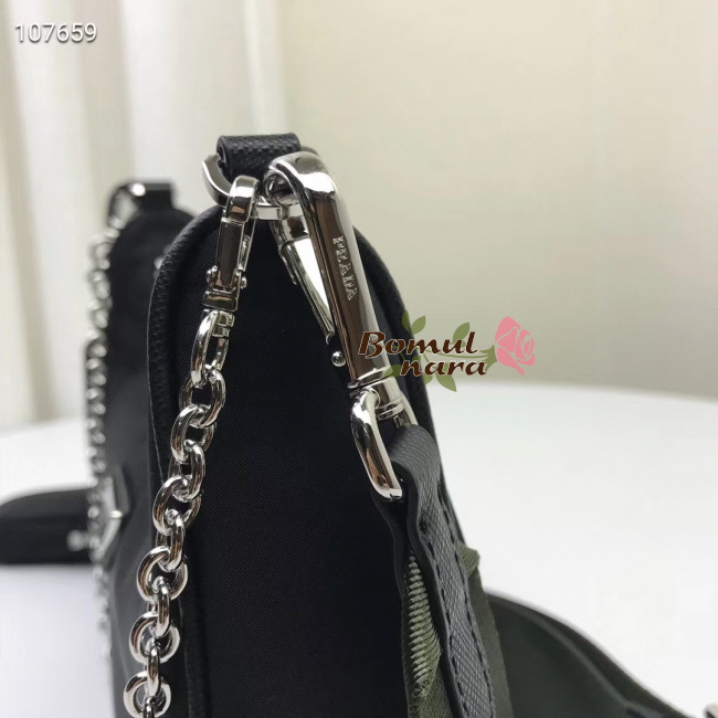 프라다가 각인되어진 패브릭 스트랩과 체인스트랩