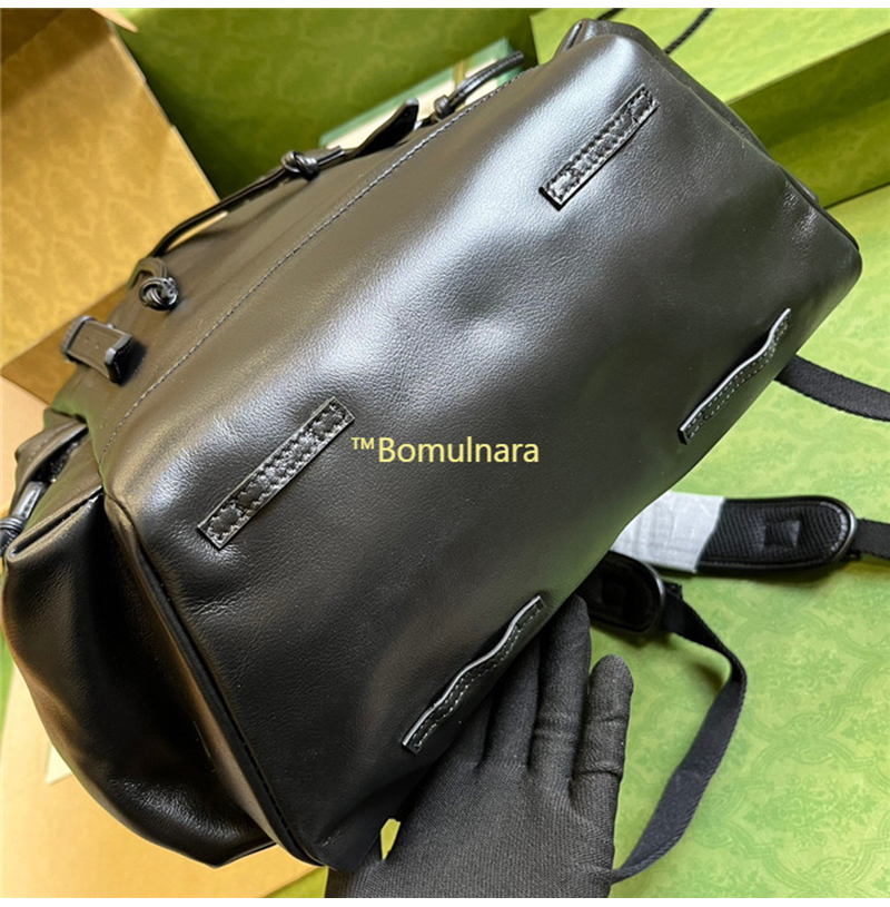 우아한 로고 감성을 자아내는 블랙 레더 백팩.