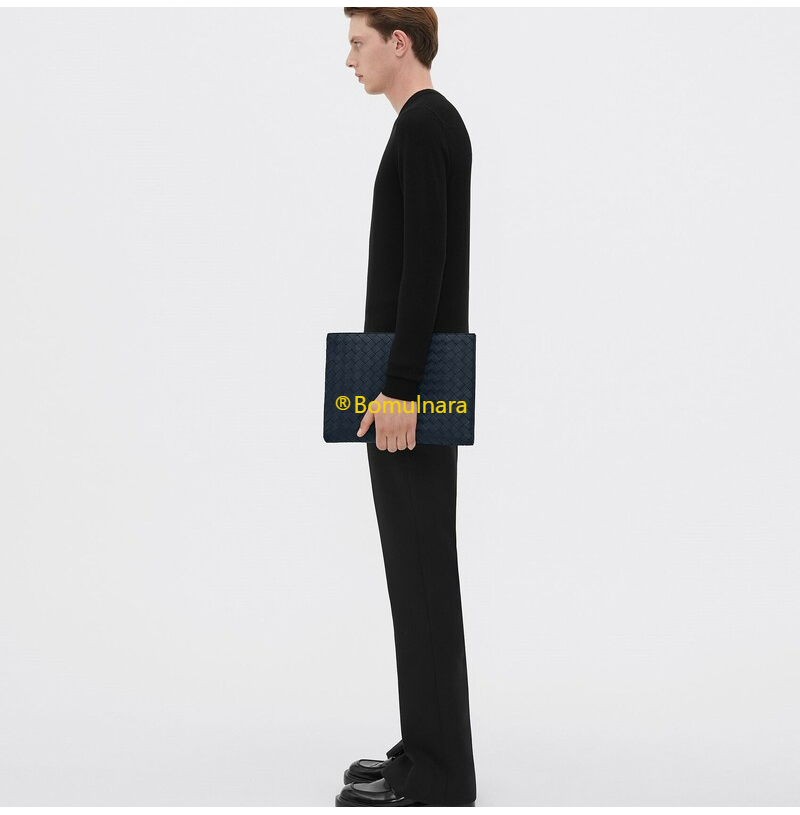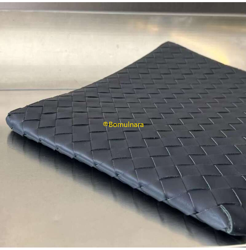 가죽 소재를 인트레치아토 위빙으로 완성한 파우치.
