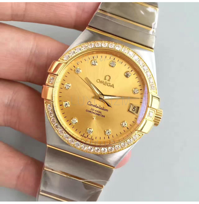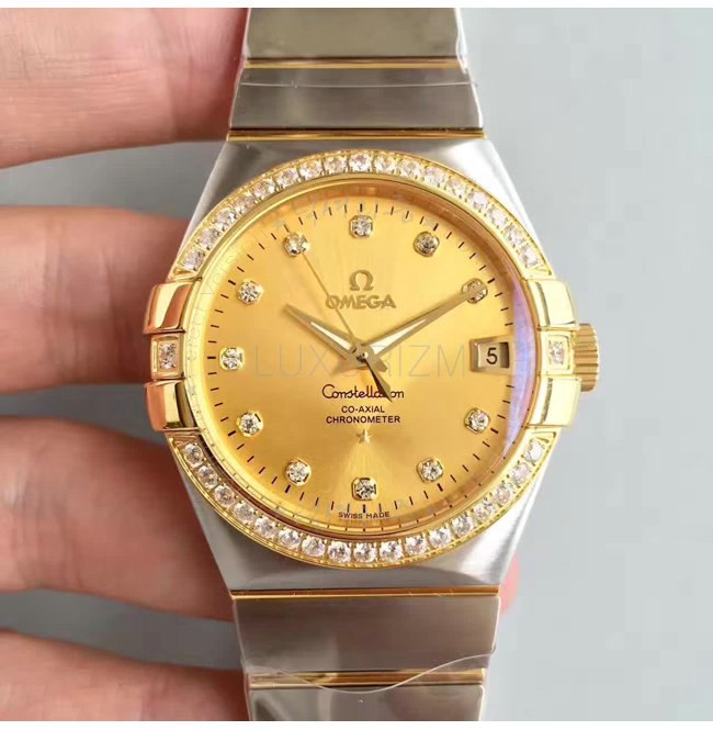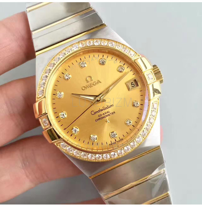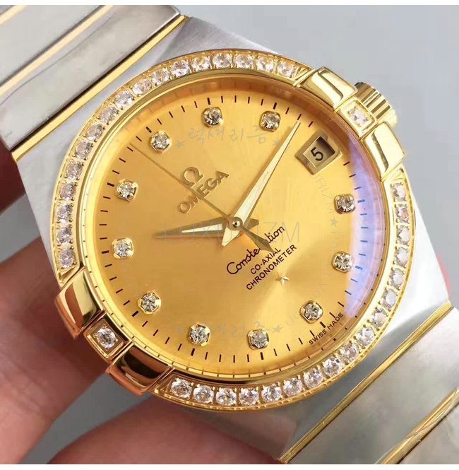 [스페셜오더]OMEGA-오메가 컨스텔레이션 다이아 인덱스 베젤 옐로우 골드 스틸 실버 신사워치 38mm