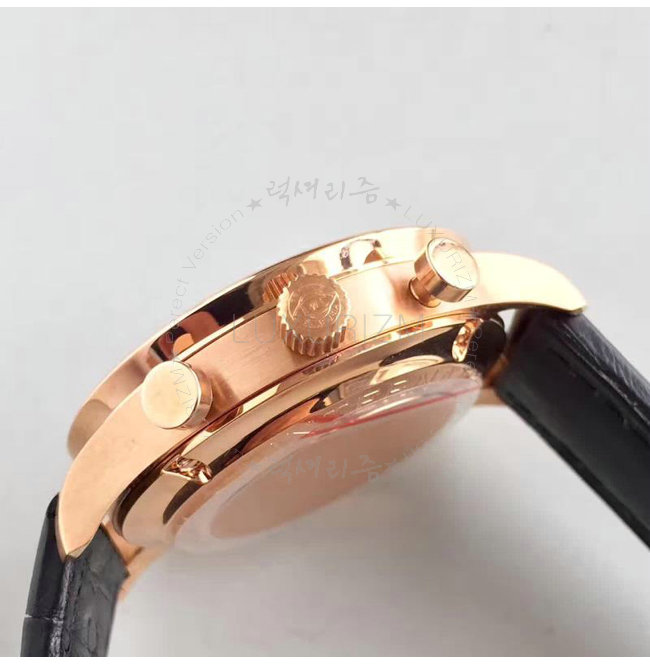 -분 초 측정 스톱워치 기능/18k(IPG)레드골드 이온 전착도금/브라운 레더스트랩.