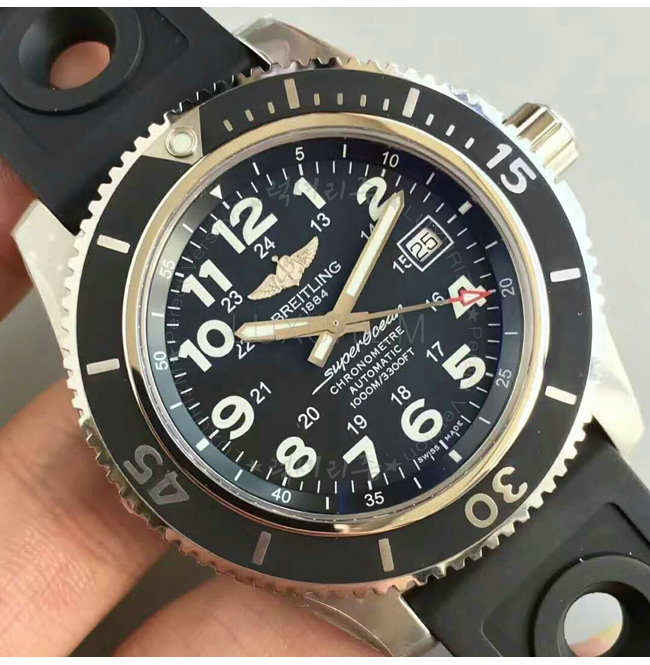최신버전인 슈퍼오션 44는 블랙 블루 다이얼에 대형숫자인덱스