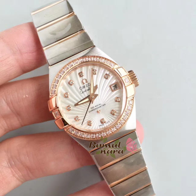 [스페셜오더]OMEGA-오메가 컨스텔레이션 레드 골드 다이아 베젤 인덱스 스틸 화이트 레이디스워치 27mm