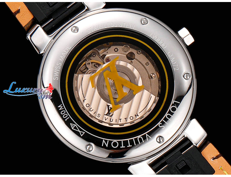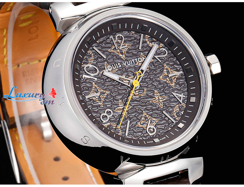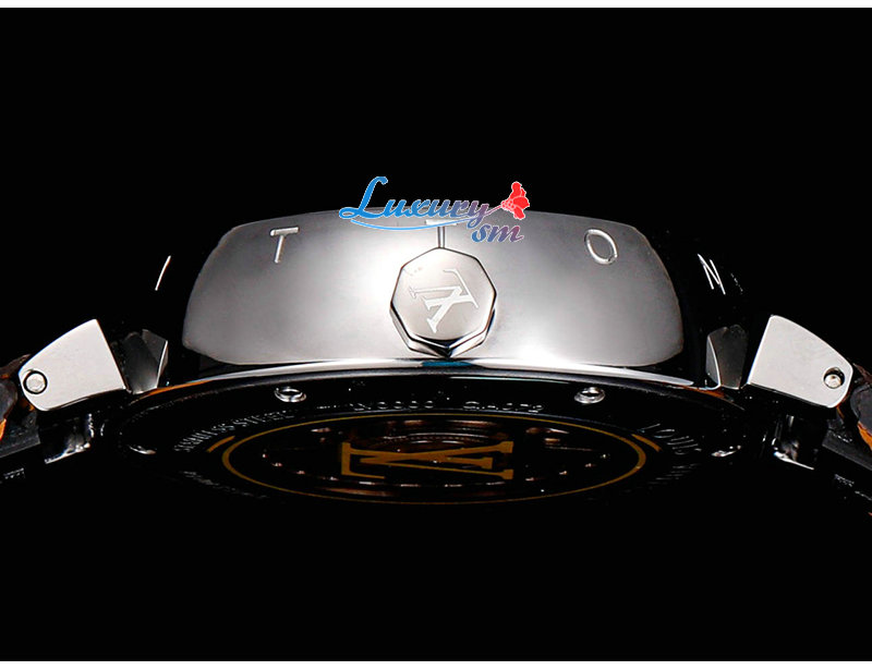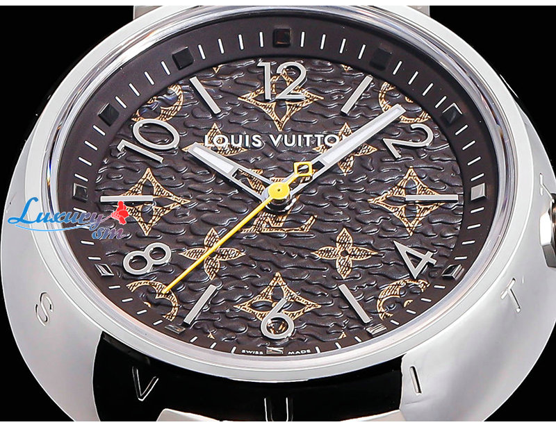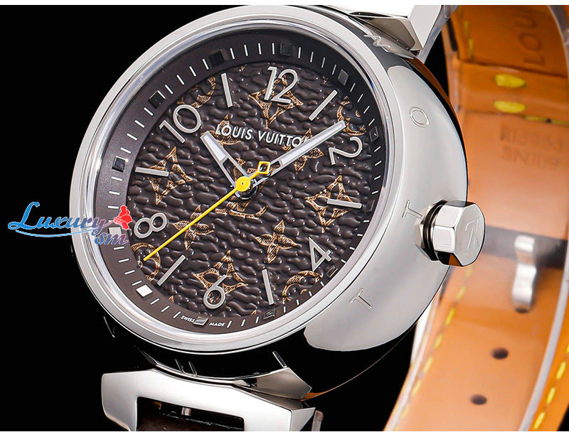 돋보이는 루이 비통의 상징적인 땅부르 워치.