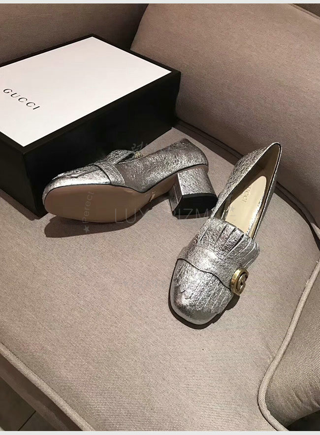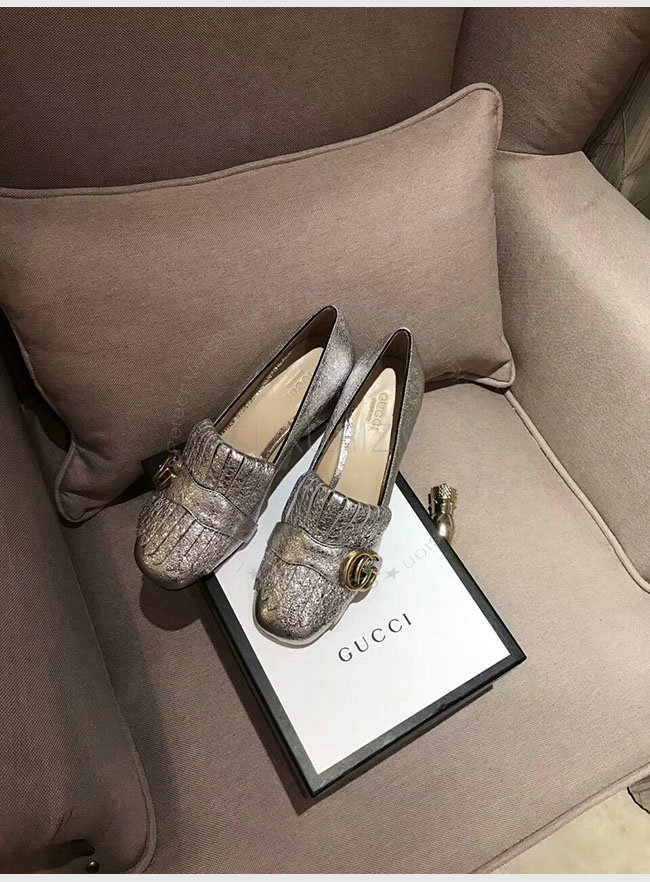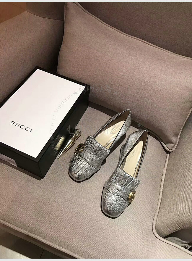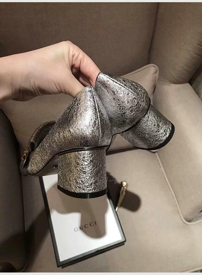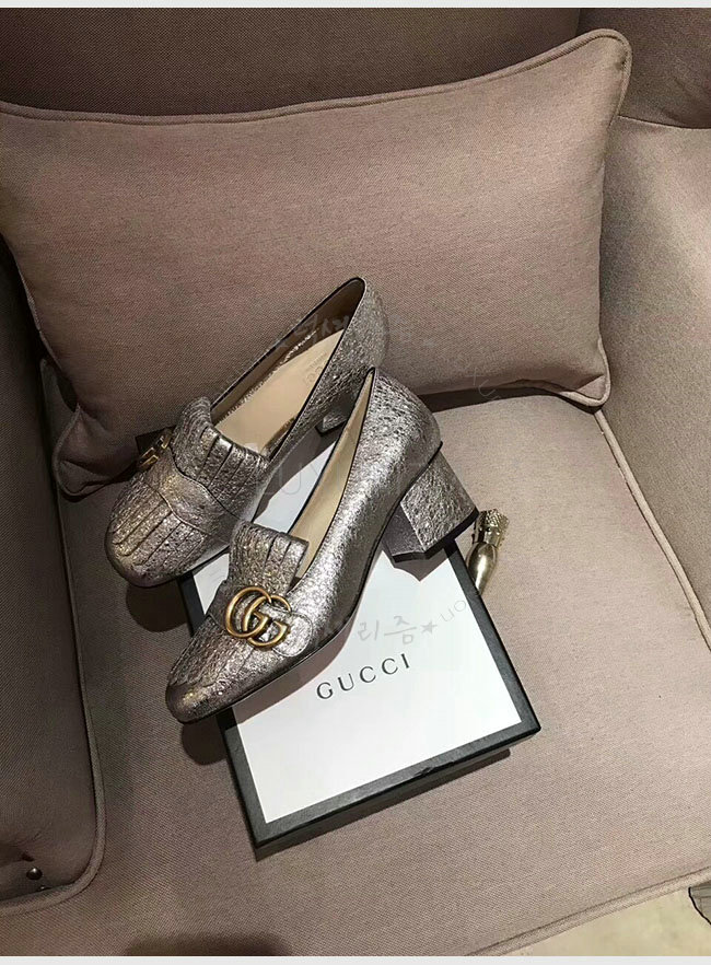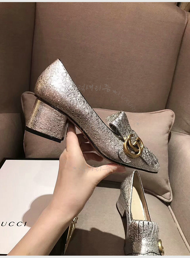 GUCCI-408208 8106 구찌 실버 메탈릭 가죽 미드힐 펌프스 여성용