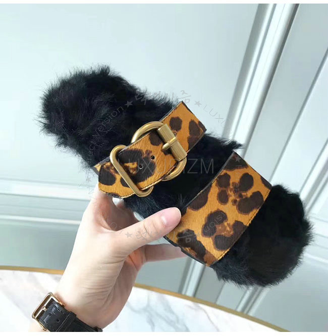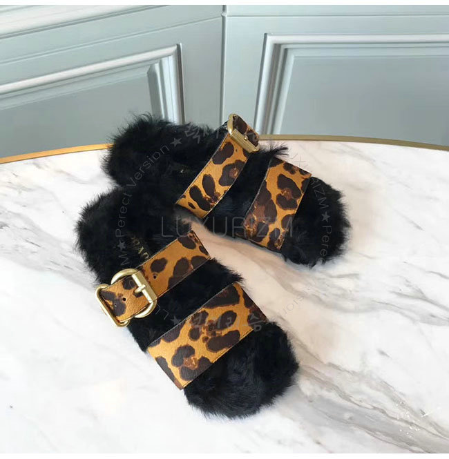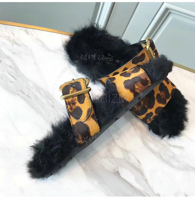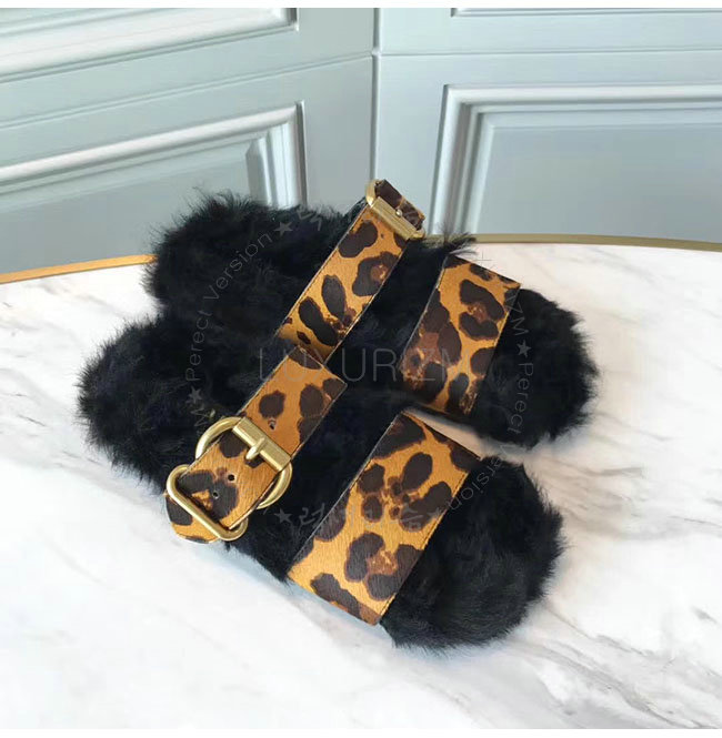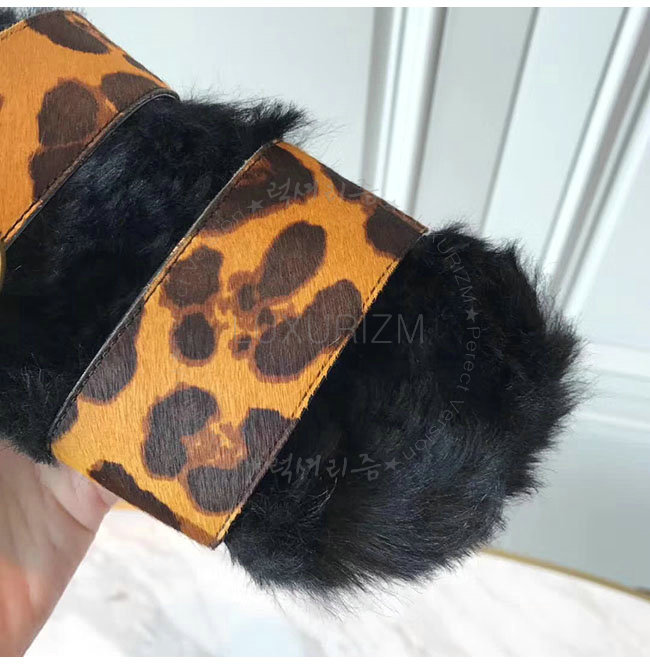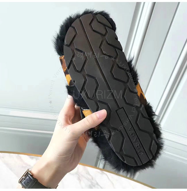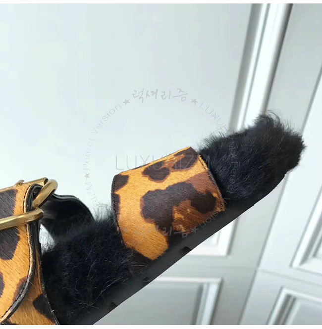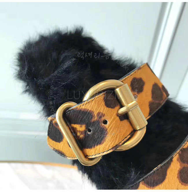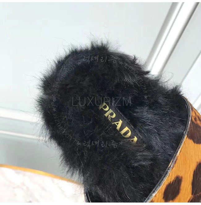 PRADA-1Q503M 프라다 호피무늬 시어링 벨벳 블랙 레오파드 스트랩 슬리퍼 여성용