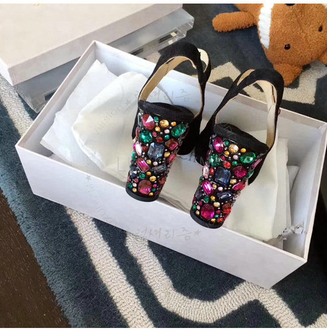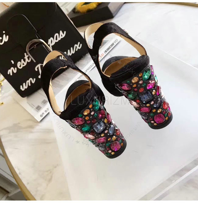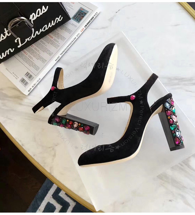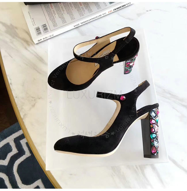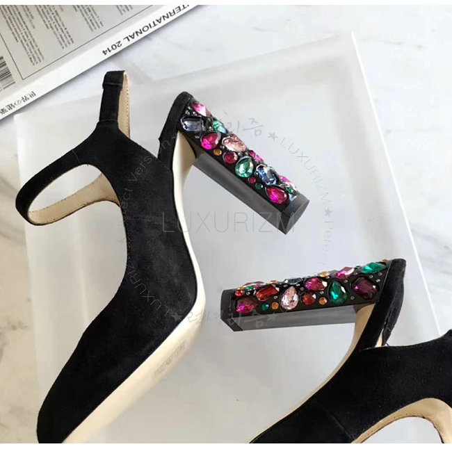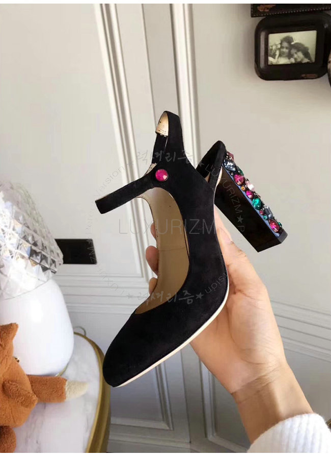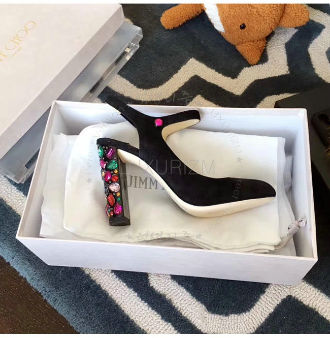 JIMMY CHOO-MEAGAN 지미추 블랙 스웨이드 가죽 라운드 투 메간 장식 힐 펌프스 여성용