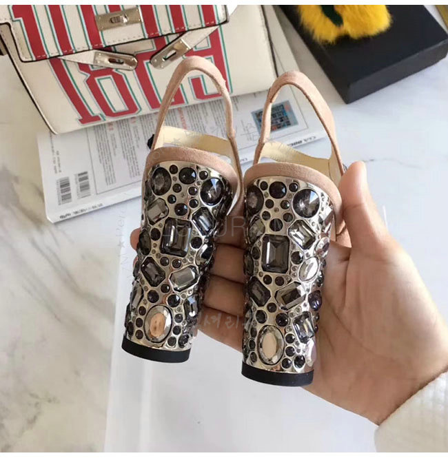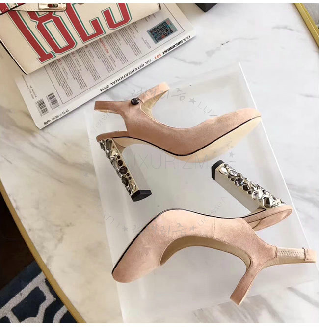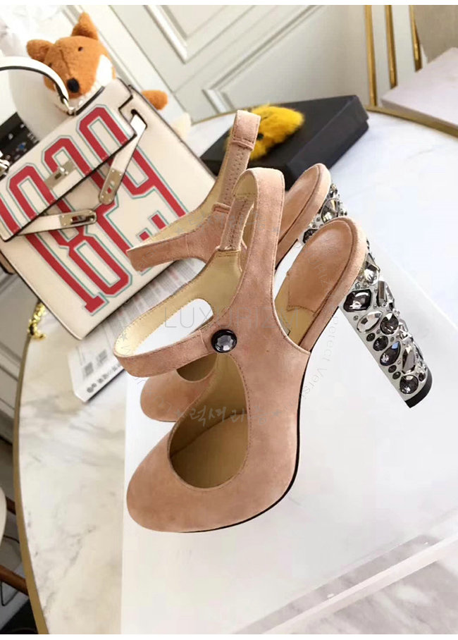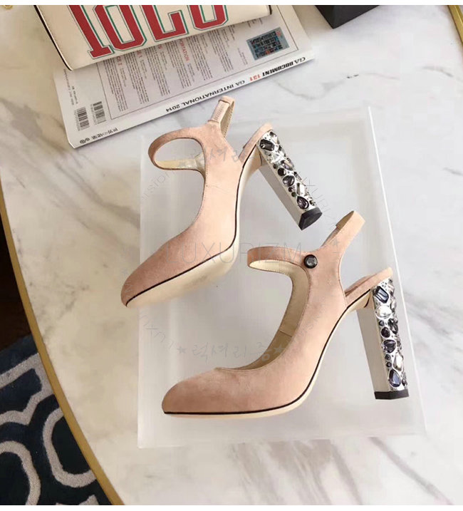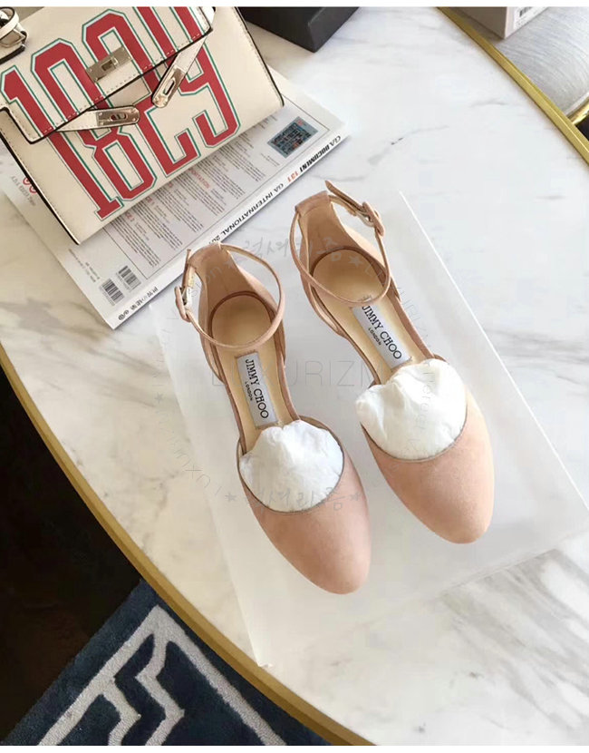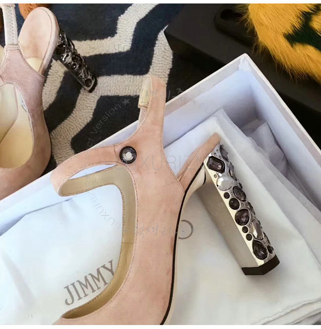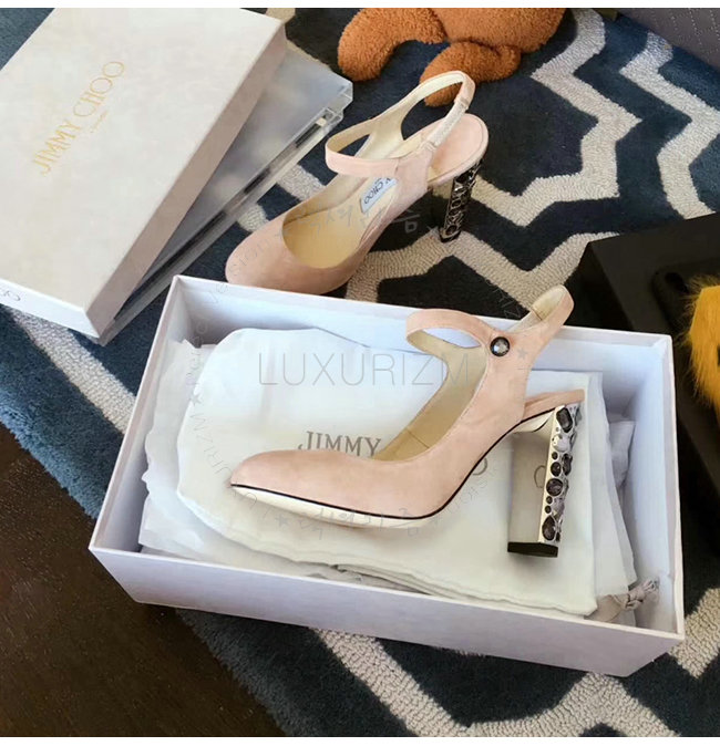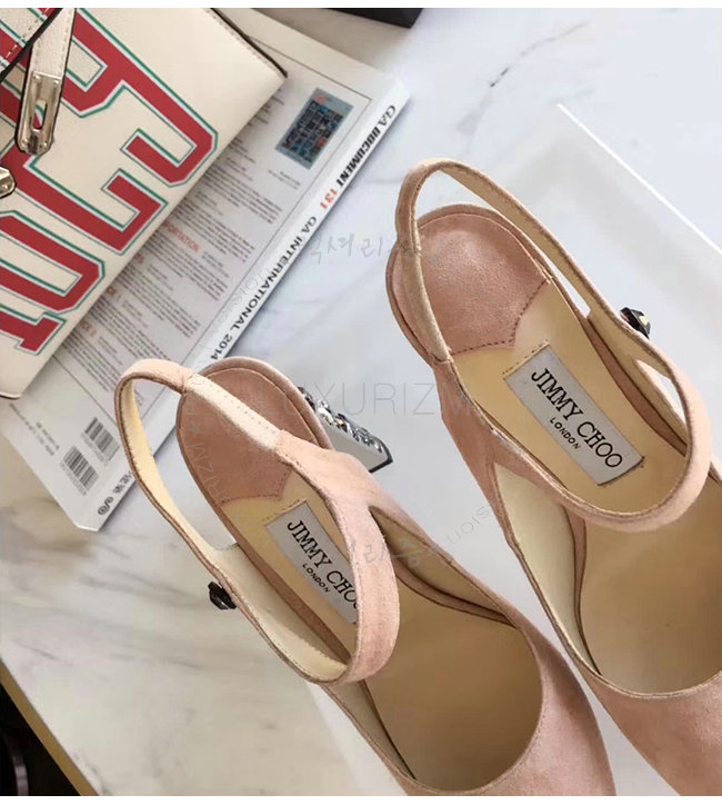 JIMMY CHOO-MEAGAN 지미추 연핑크 스웨이드 가죽 라운드 투 메간 장식 힐 펌프스 여성용