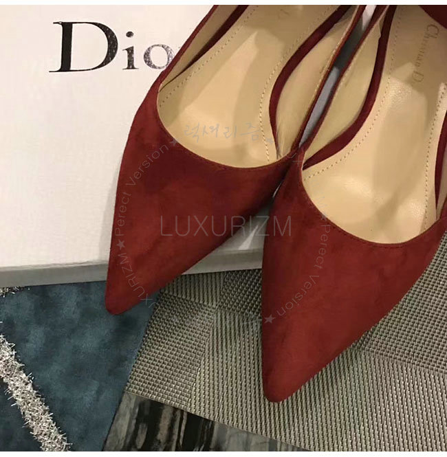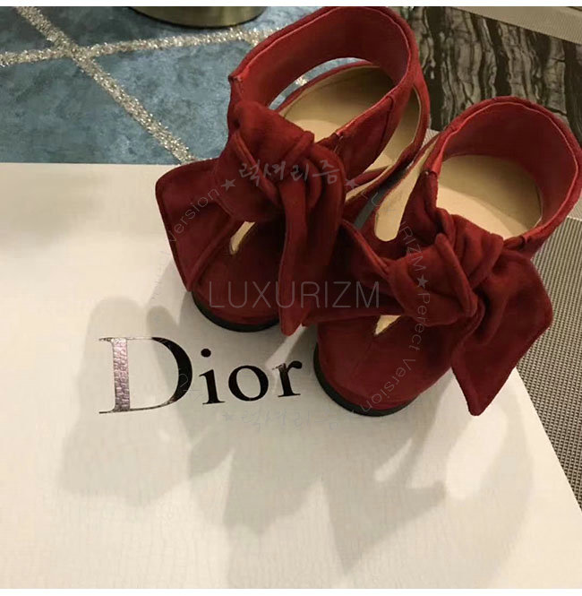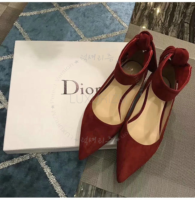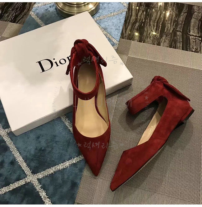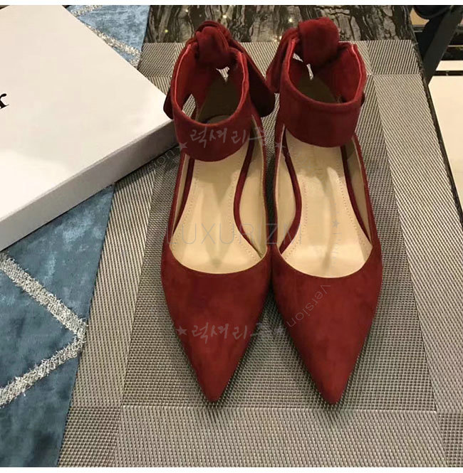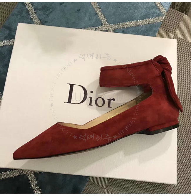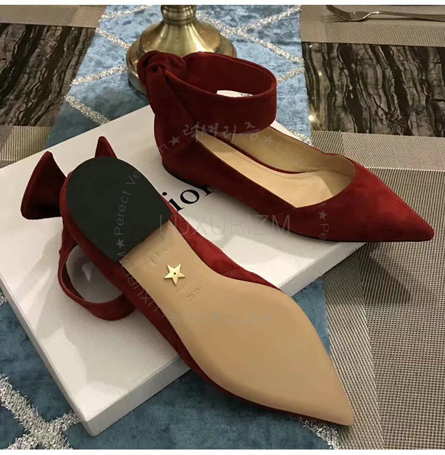 DIOR-KCB406 디올 레드 스웨이드 양가죽 리본 발레 펌프스 여성용