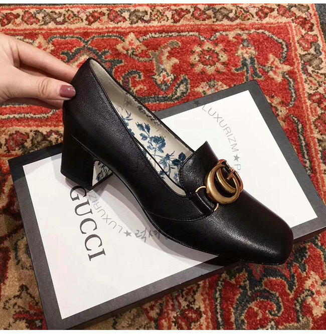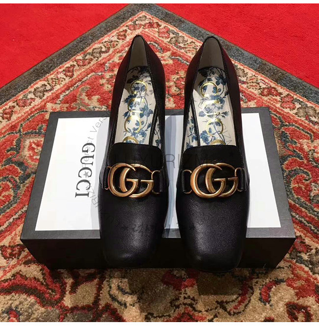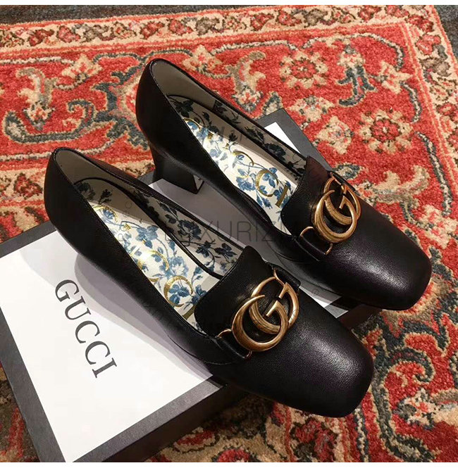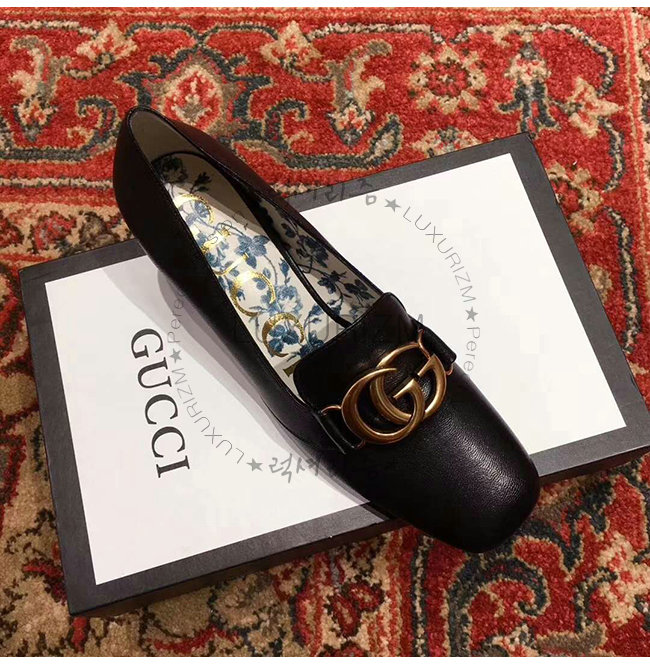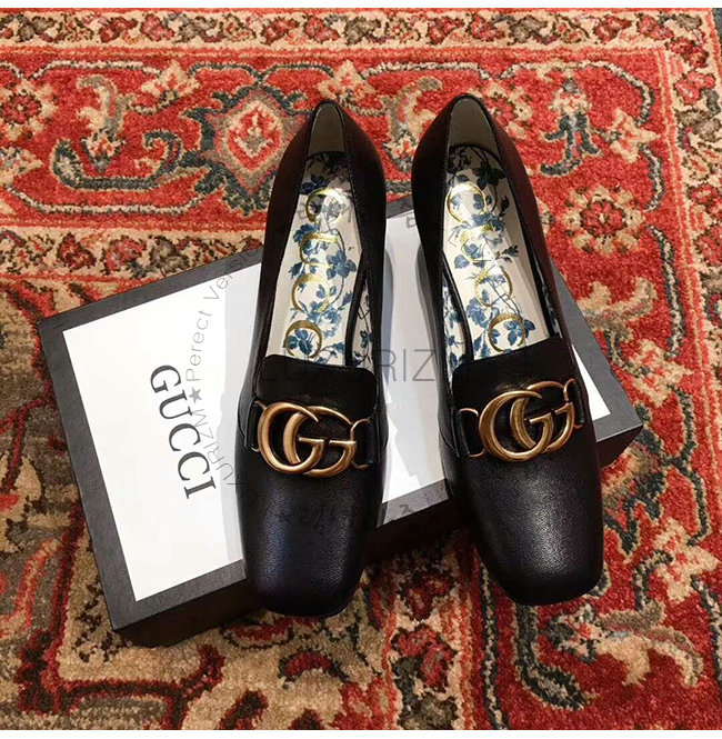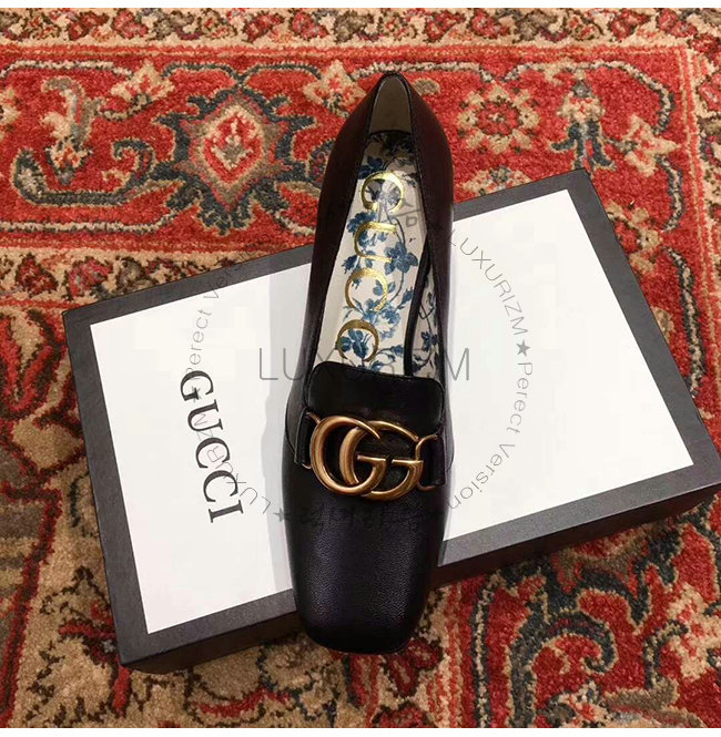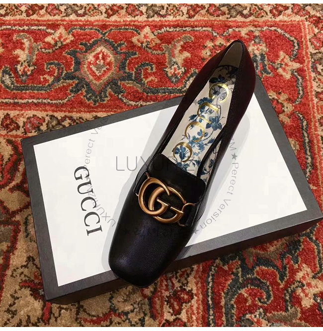 GUCCI-525333 1000 구찌 빅토아르 블랙 가죽 더블 G 장식 미드힐 펌프스