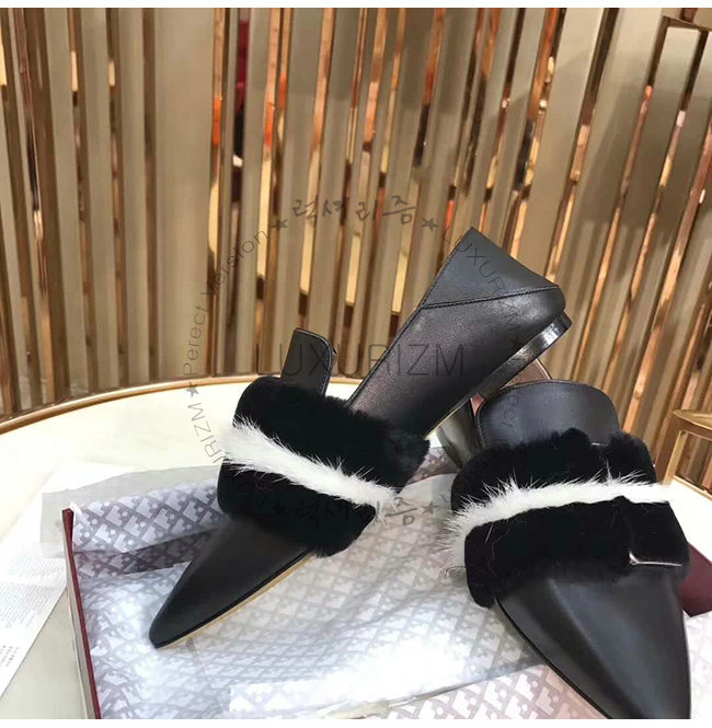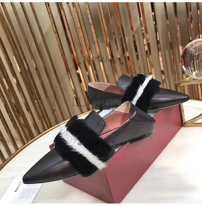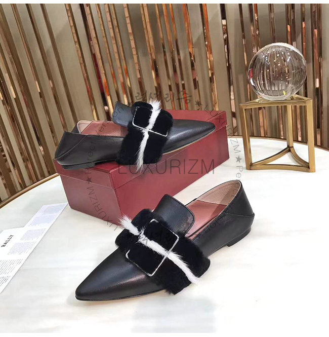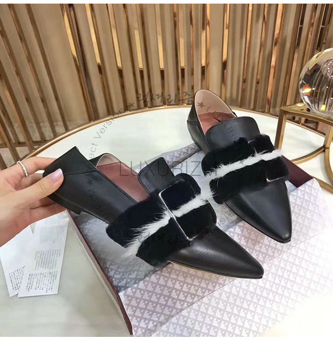 송아지 가죽 가죽 밑창 직사각형, 얇은 버클 뾰족한 발가락 비버 모피 디테일.