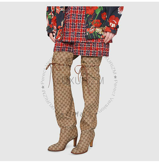 오리지널 GG 캔버스 가죽 트리밍 신축성있는 넥타이 디테일 8.5cm 힐 70cm 샤프트 높이.