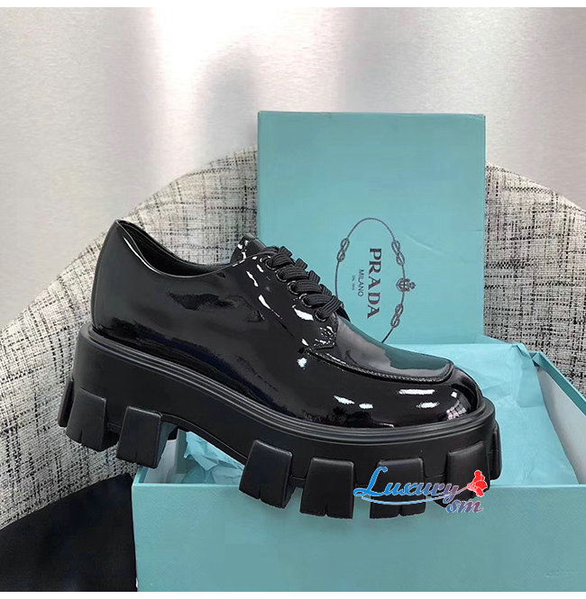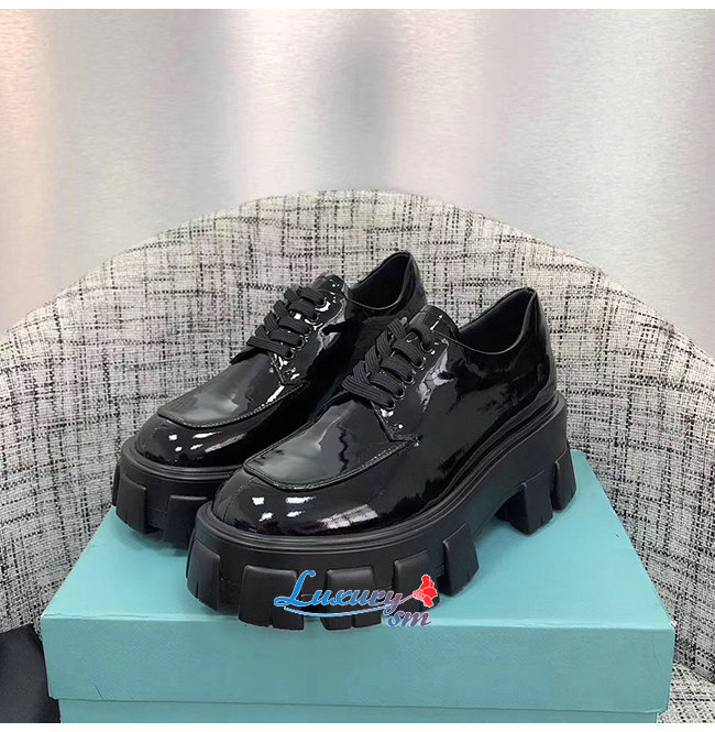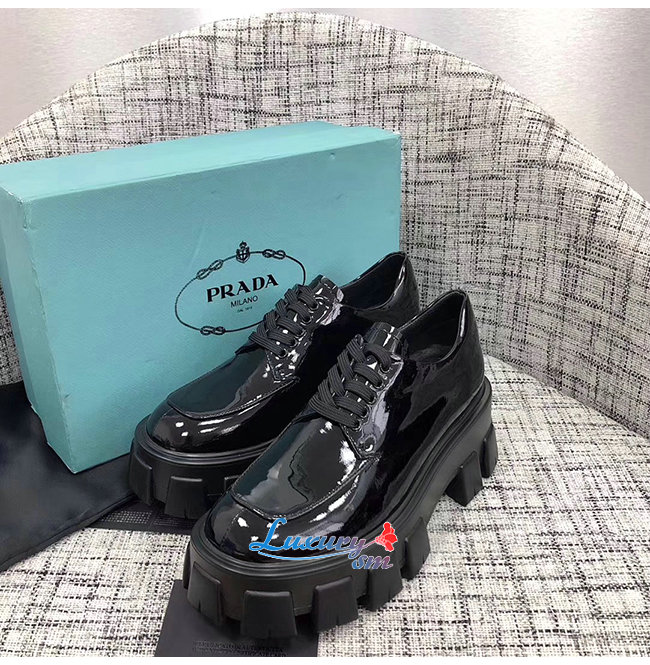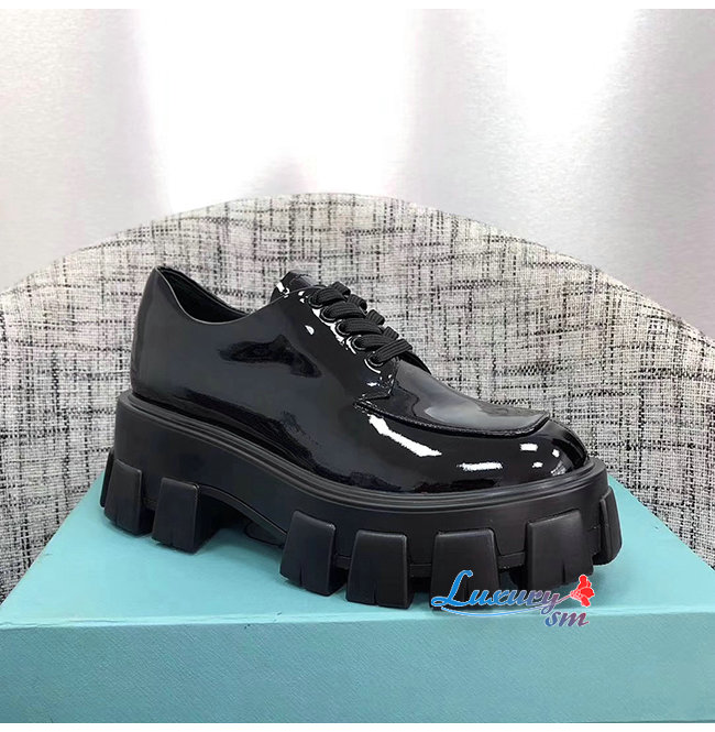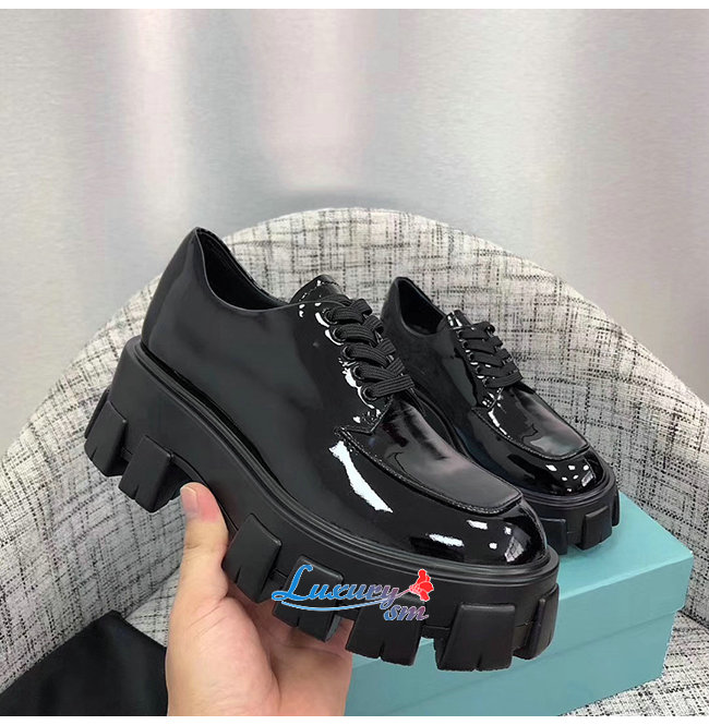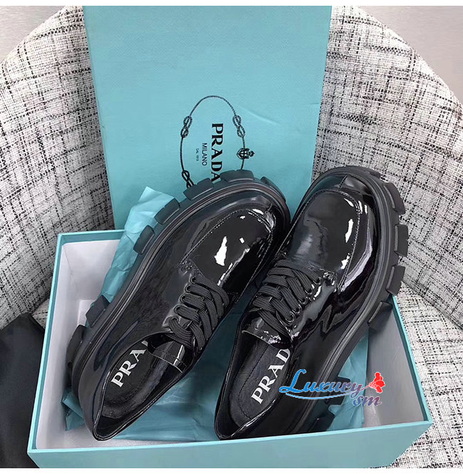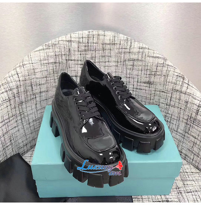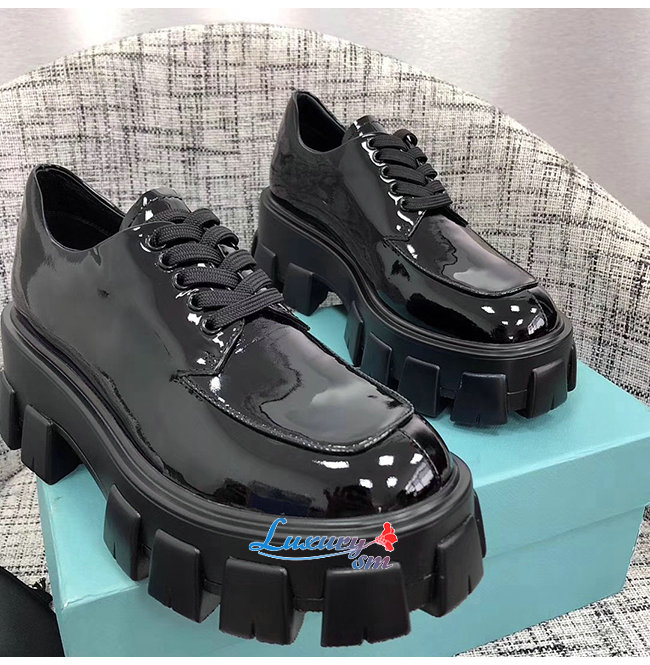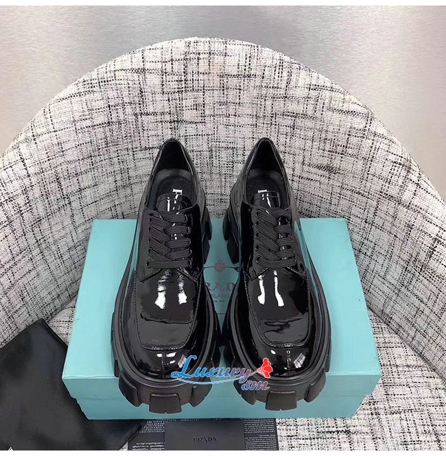 PRADA-1E708L 프라다 블랙 모노라이트 페이턴트 가죽 레이스 더비 슈즈