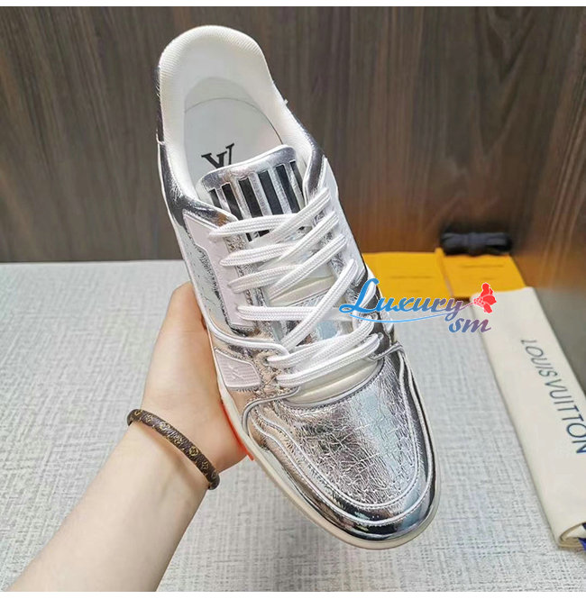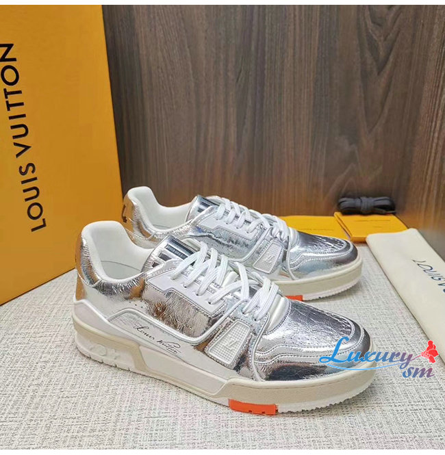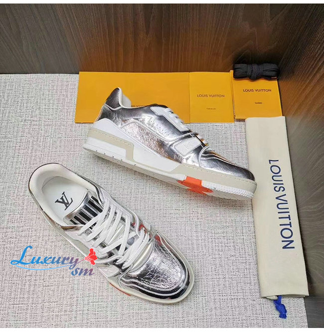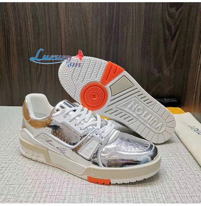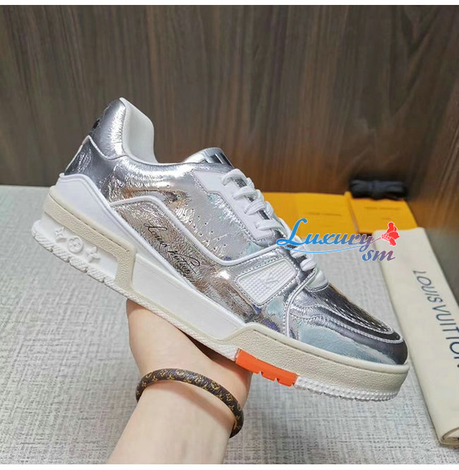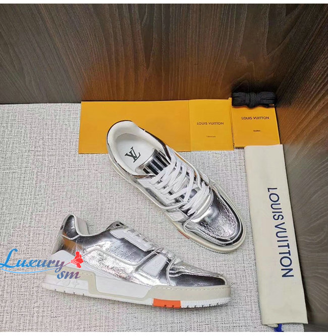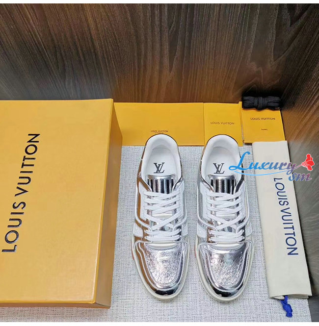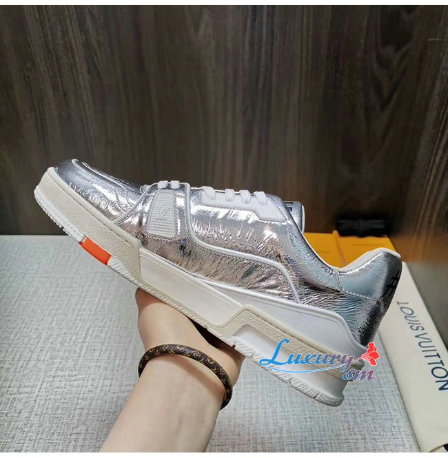 메탈릭 실버 색상의 가죽 으로 제작된 LV 트레이너