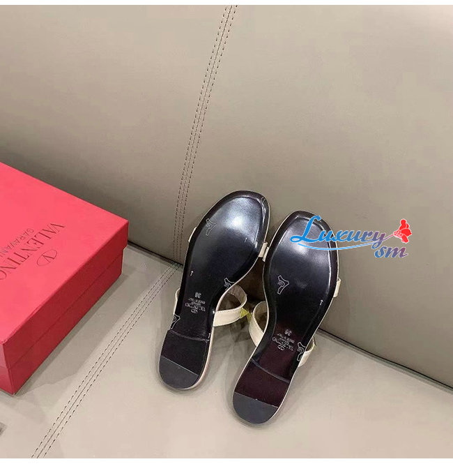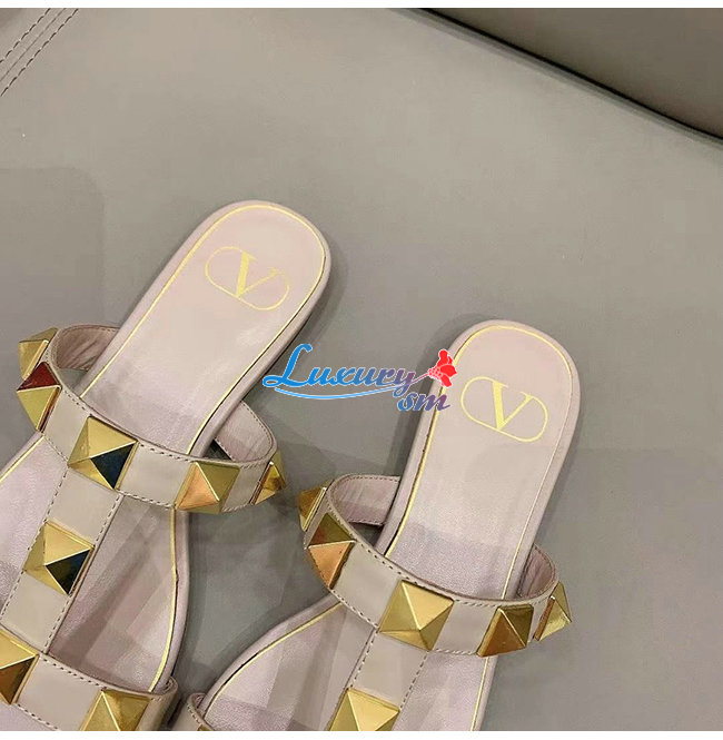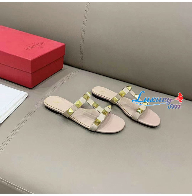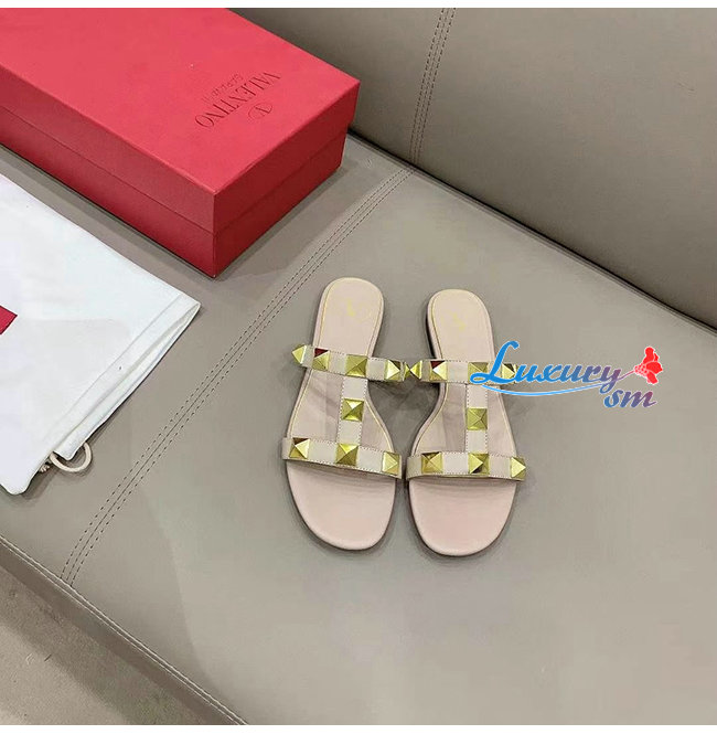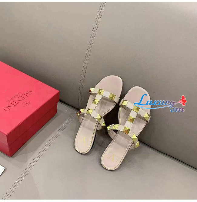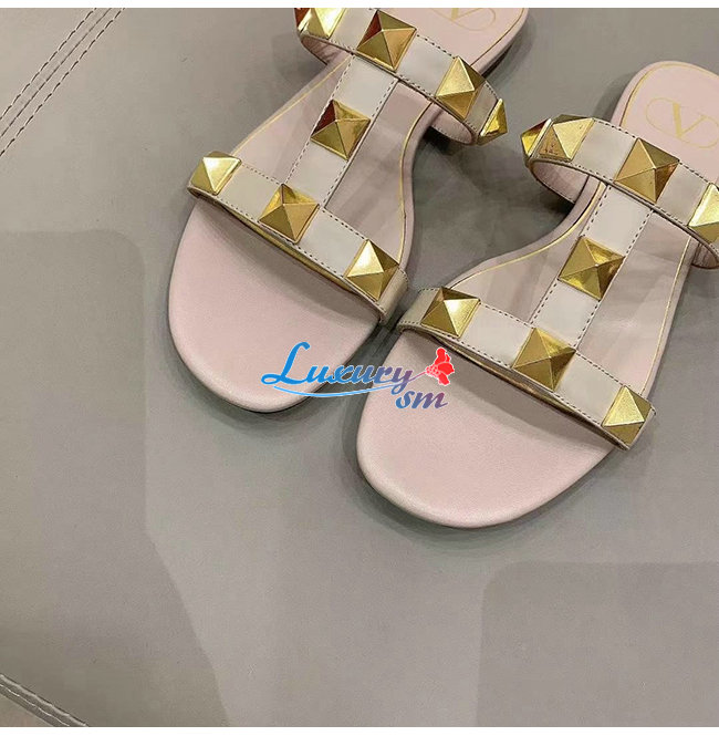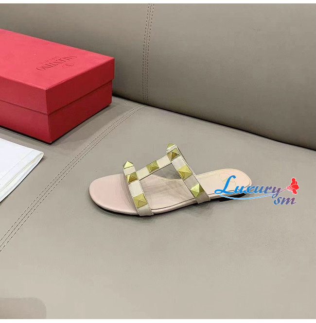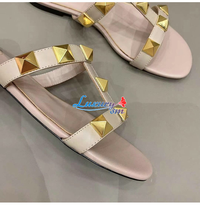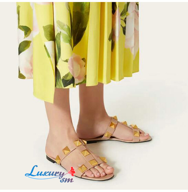 VALENTINO-VW0S0BU 발렌티노 로즈 송아지 가죽 ROMAN STUD 플랫 슬라이드 샌들 여성용