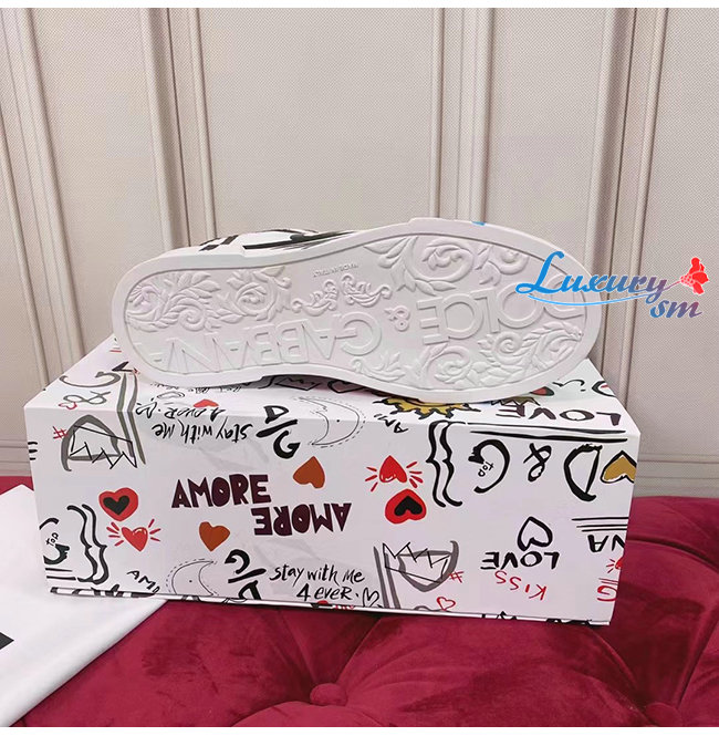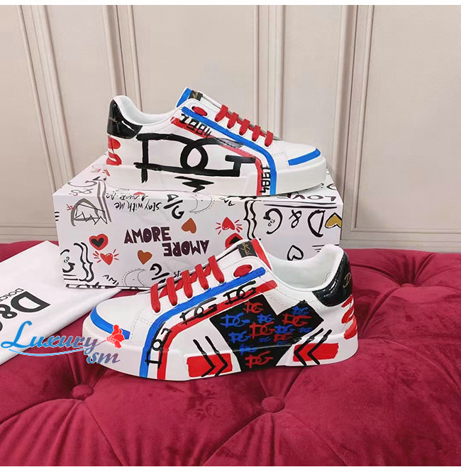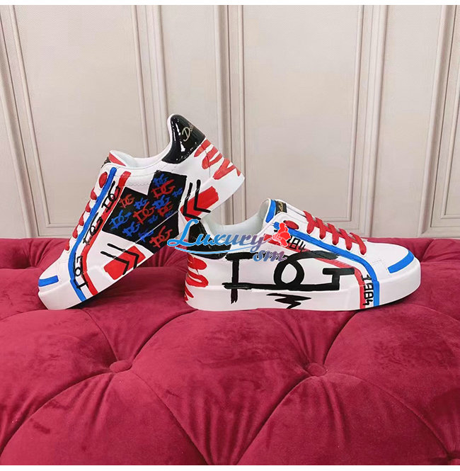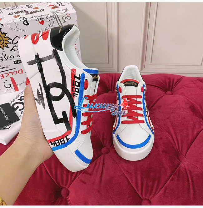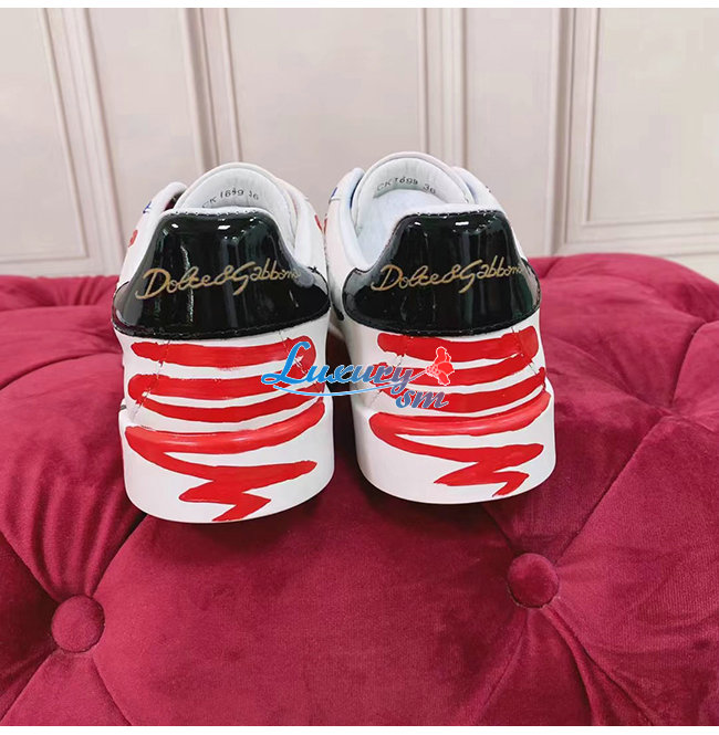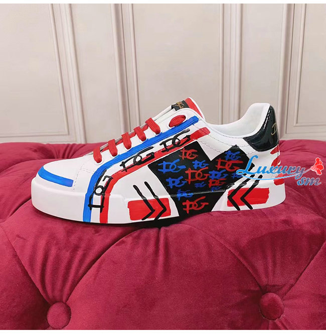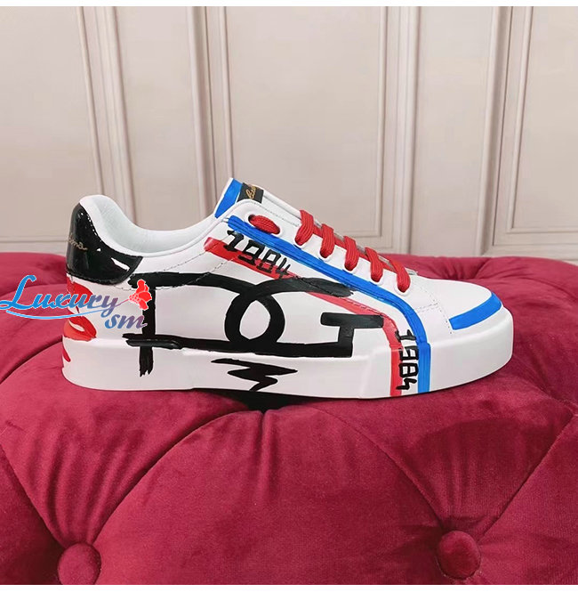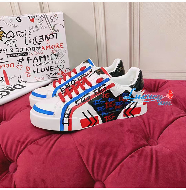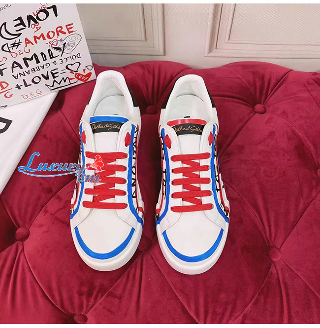 Dolce and Gabbana-돌체 앤 가바나 화이트/블루 카프스킨 프린트 장식 포르토피노 스니커즈 남여공용