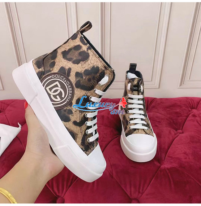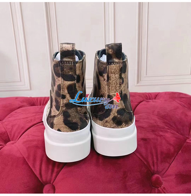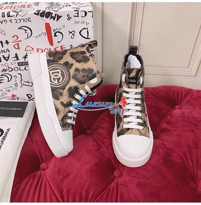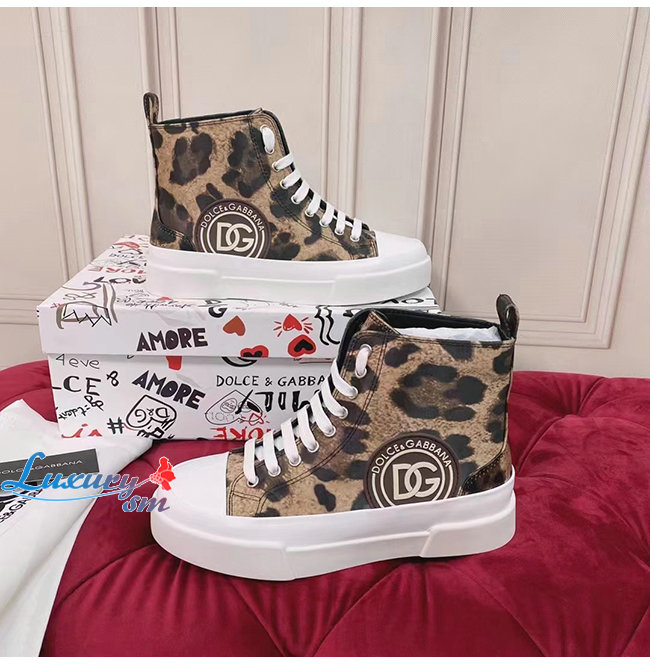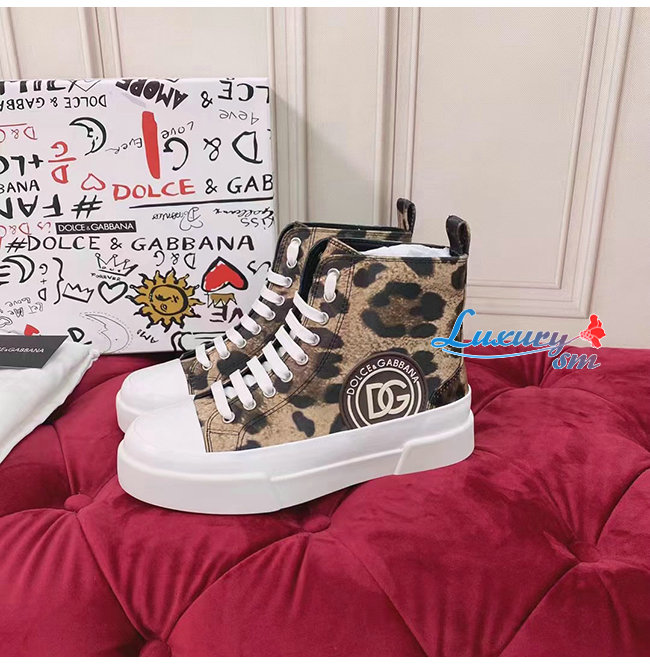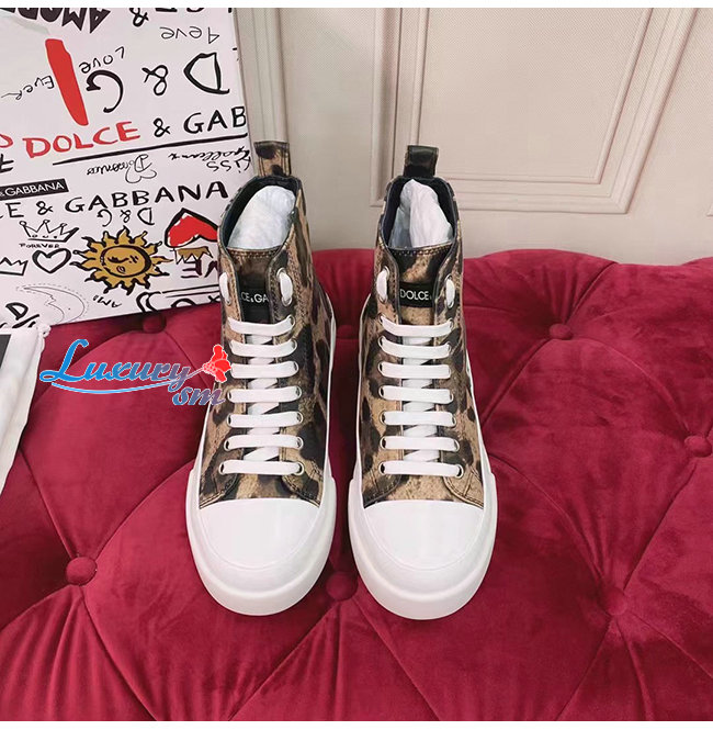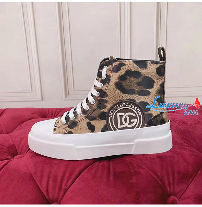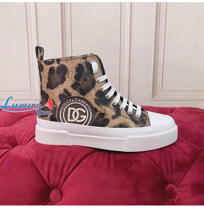Dolce and Gabbana-돌체 앤 가바나 브라운 코튼 레오파드 프린트 장식 포르토피노 라이트 미드탑 스니커즈 여성용