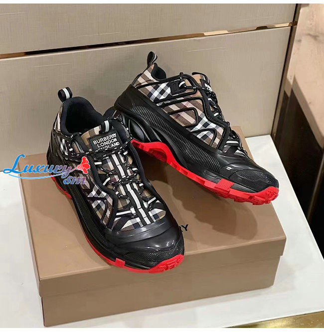 BURBERRY-80217721 버버리 베이지/레드 빈티지 체크 코튼 누벅 아서 스니커즈