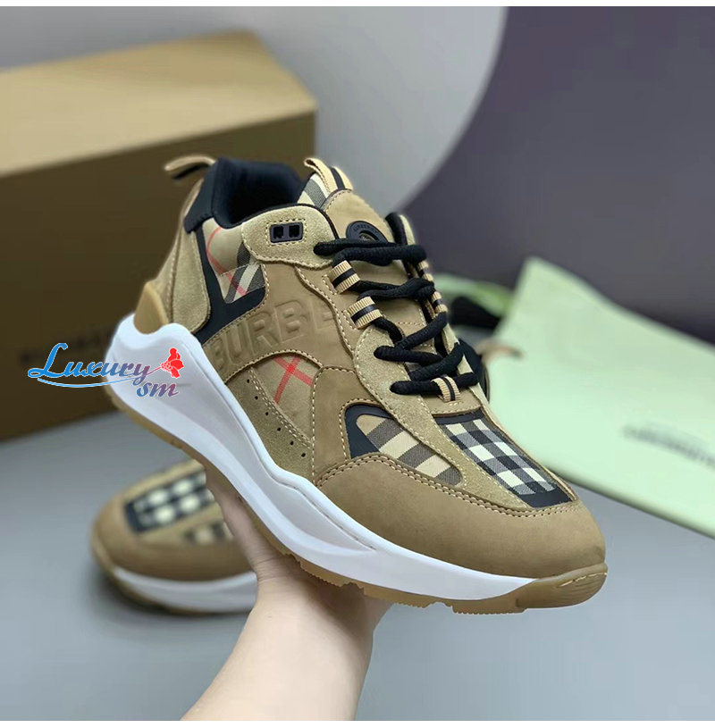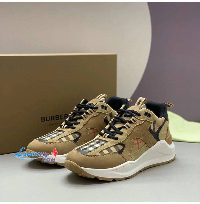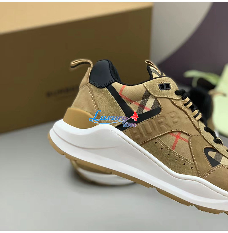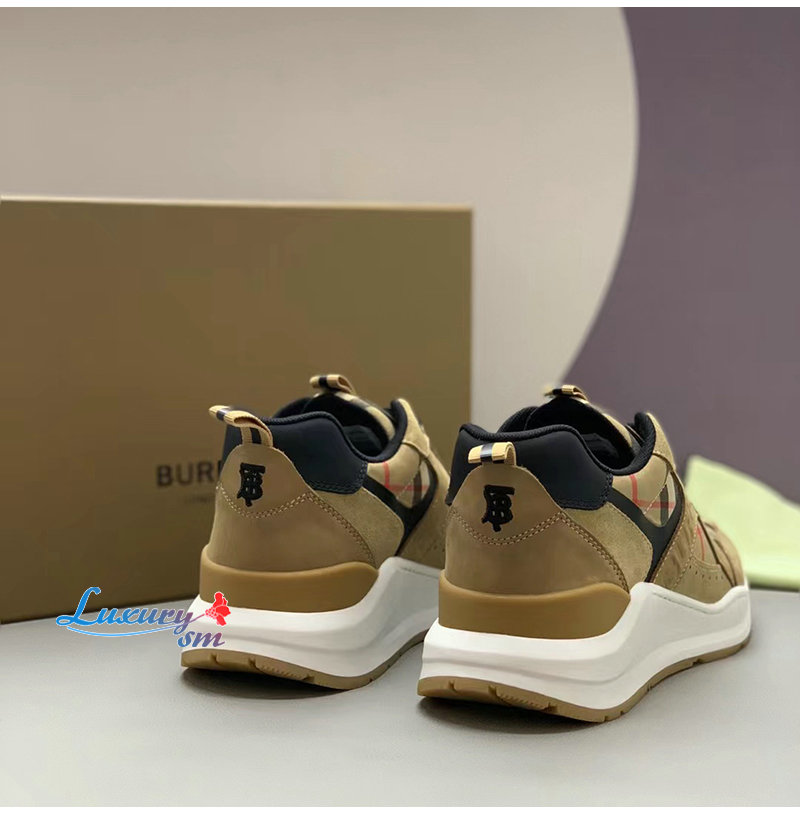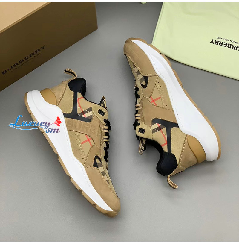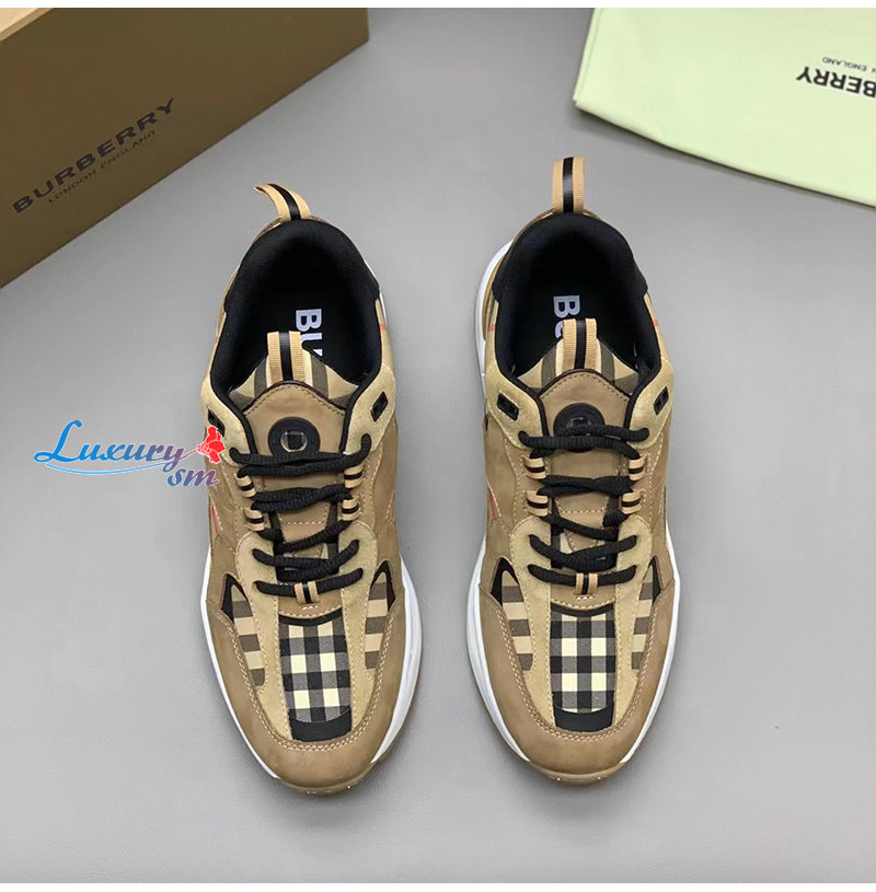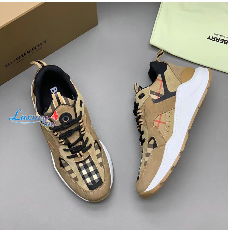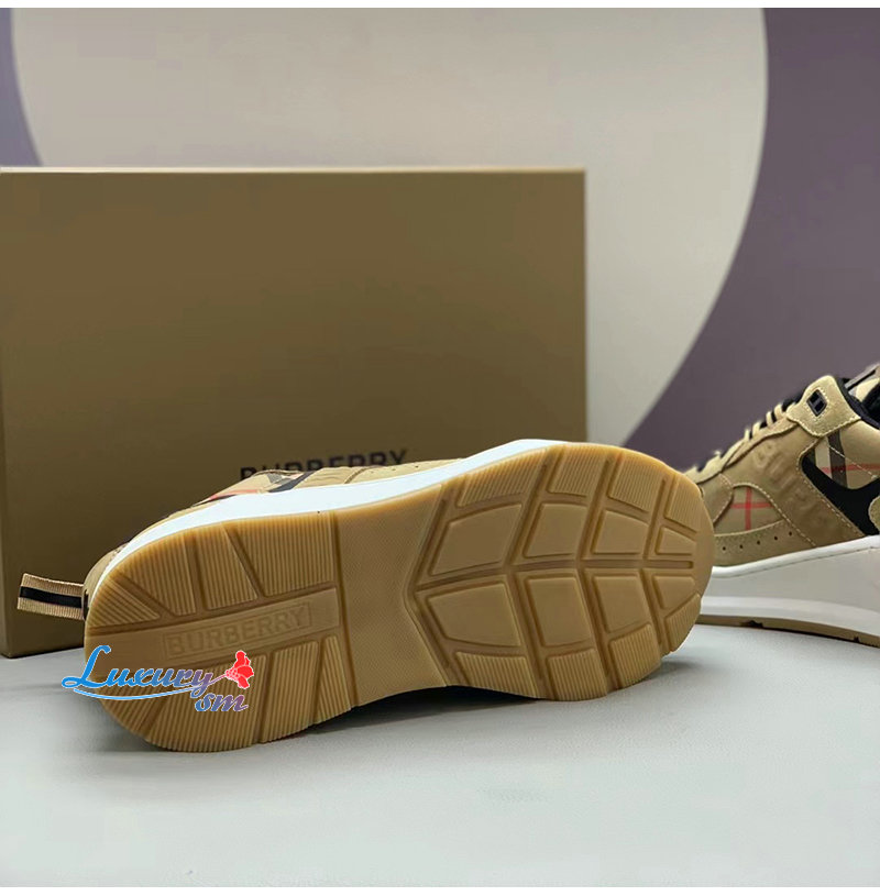 BURBERRY-80708511 버버리 베이지 체크 레더 스웨이드 스니커즈 남성용