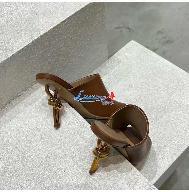 골드 메탈 놋 힐이 돋보이는 뮬. 가죽 아웃솔을