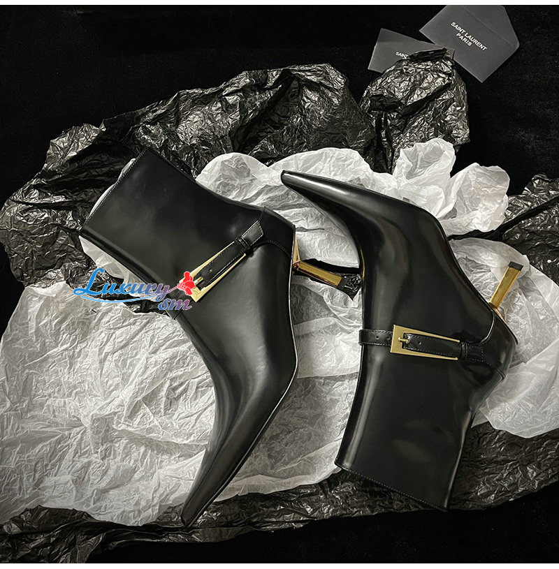 앵클 부츠. 포인티드 토, 기하학적인 골드 도금
