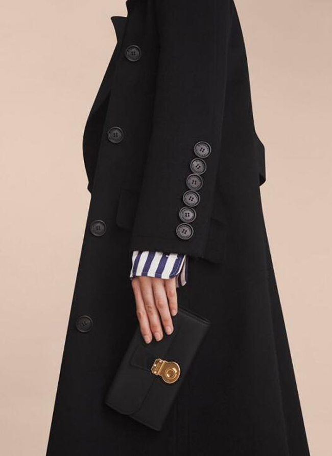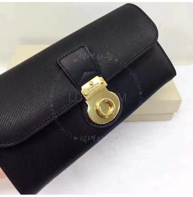 버버리만의 새로운 트렌치 가죽 소재로 제작된 장지갑. 독특한 잠금 장식이 돋보이며