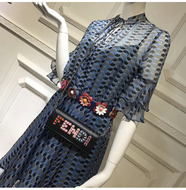 스터드장식 3D버전의 FENDI문구 연출 펀 페어 테마에서 영감을 받은 모티프.팔라듐 피니싱 메탈장식.