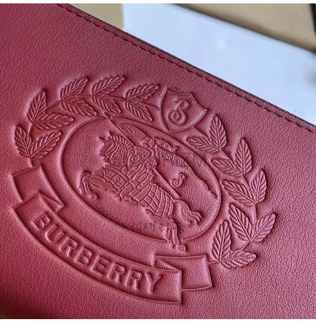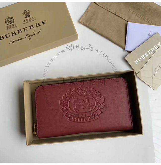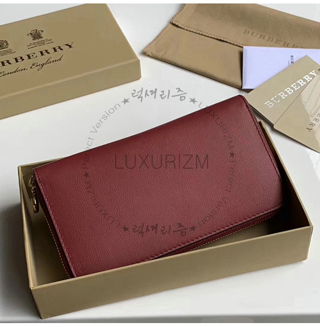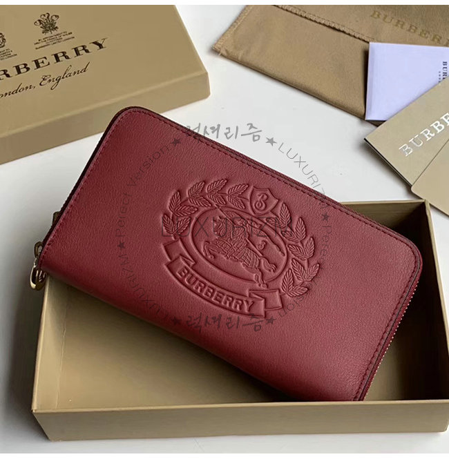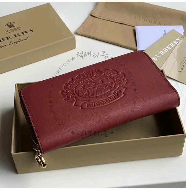 [스페셜오더]BURBERRY-40779851 버버리 레드 송아지 가죽 엠보싱 크레스트 투톤 지퍼라운드 지갑