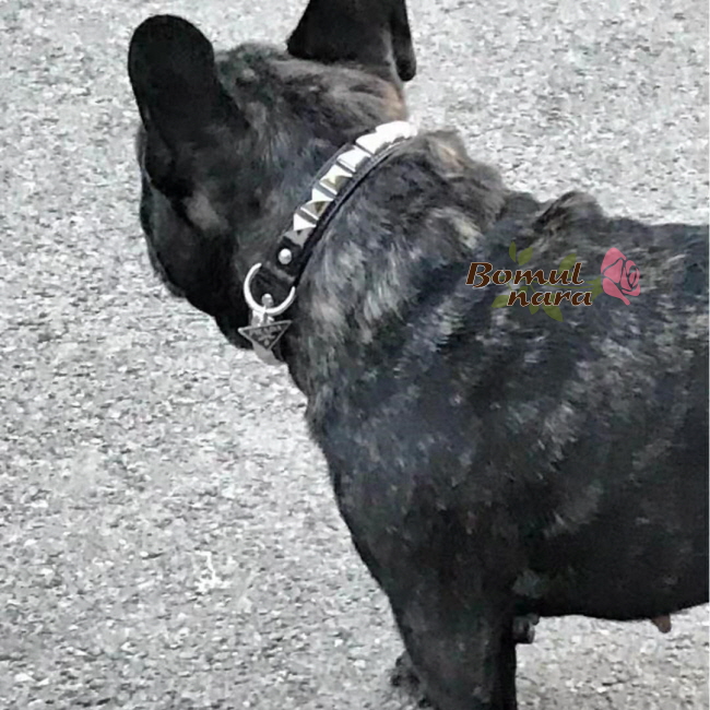 메탈 스터드와 메탈 트라이앵글 로고로 장식한 반려동물