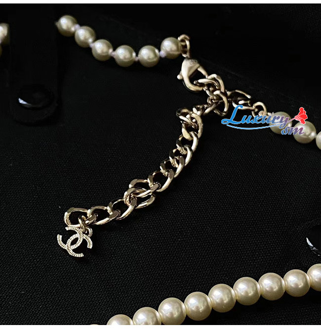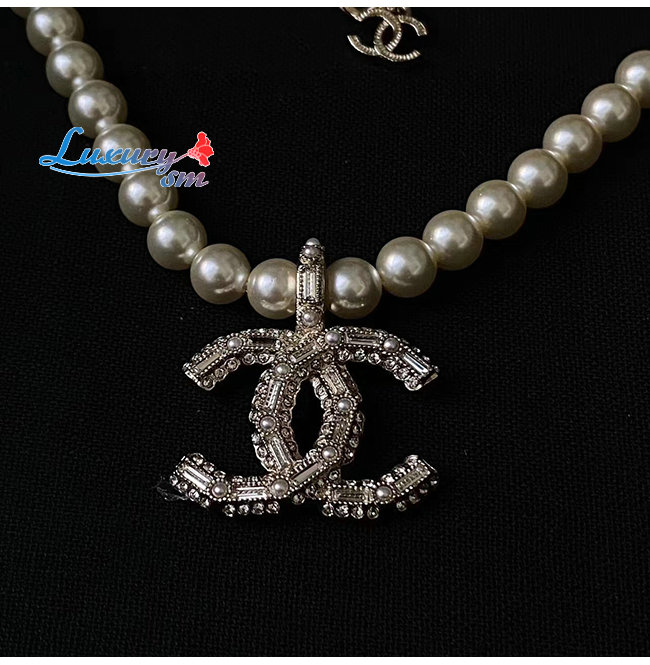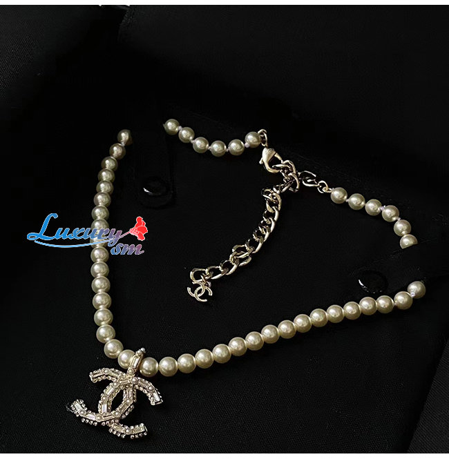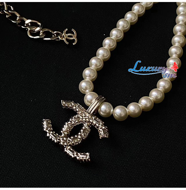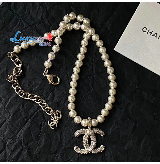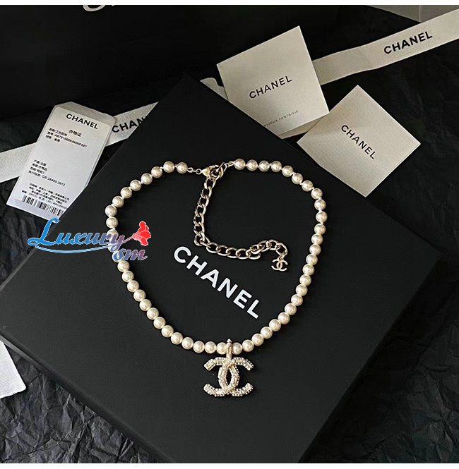 CHANEL-7094 샤넬 골드/화이트 레진 진주 크리스탈 장식 CC 로고 목걸이