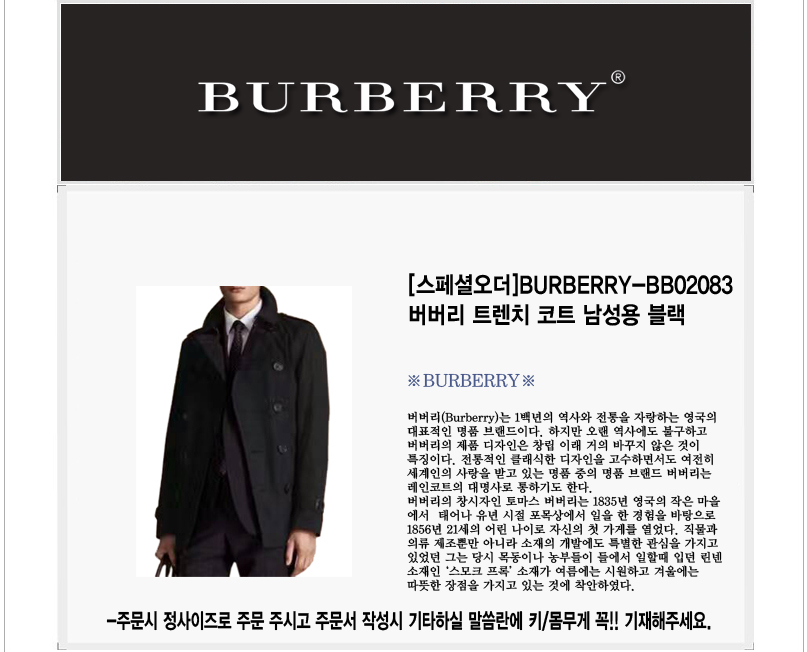 [스페셜오더]BURBERRY-BB02083 버버리 트렌치 코트 남성용 블랙