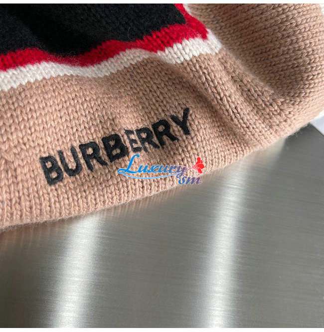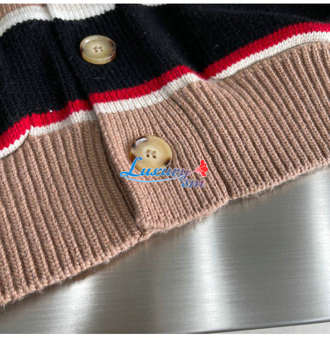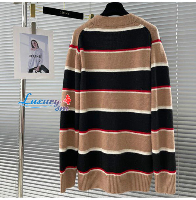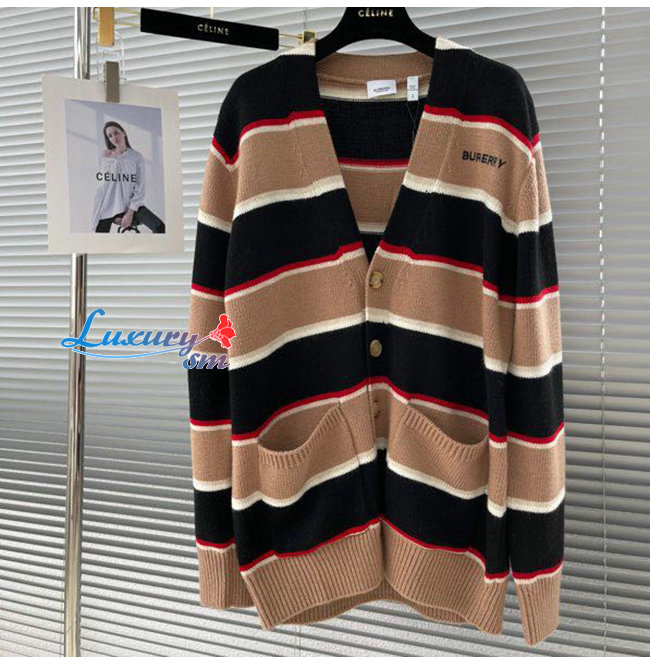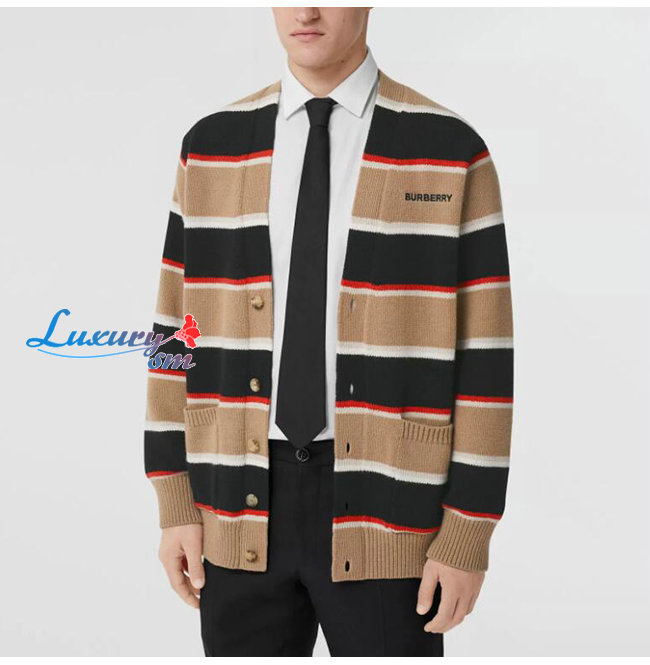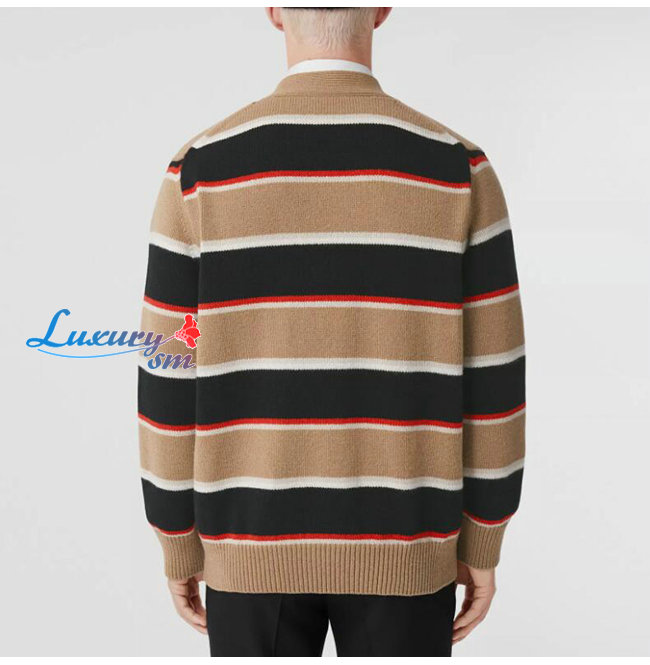 BURBERRY-80502611 버버리 카멜 엠브로이더리 로고 스트라이프 카디건