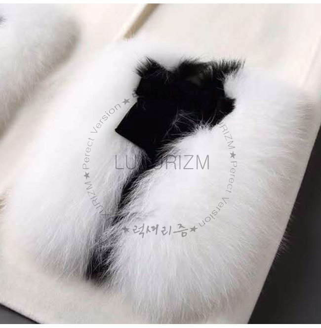 울 소재. 톤온톤 벨벳 보우로 피니싱한 폭스 퍼 맥시 포켓.