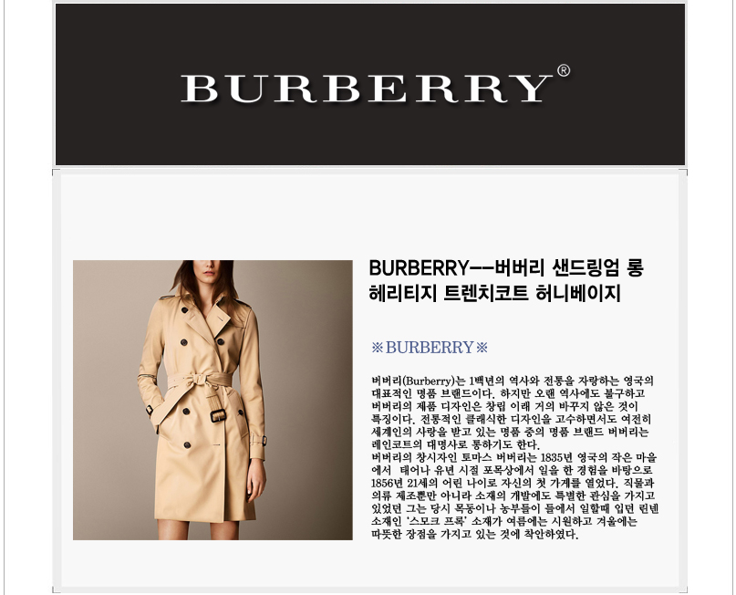 [스페셜오더]BURBERRY-버버리 샌드링엄 미드 렝스 헤리티지 트렌치코트 허니베이지 가격 : 450,000원