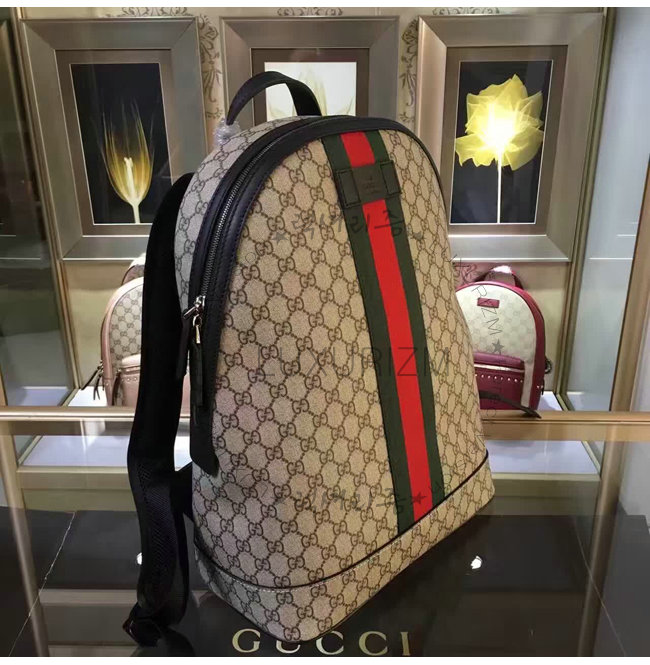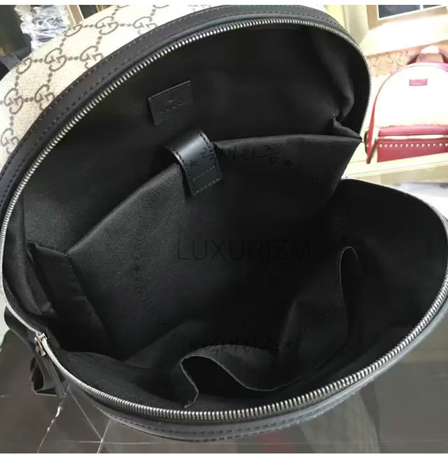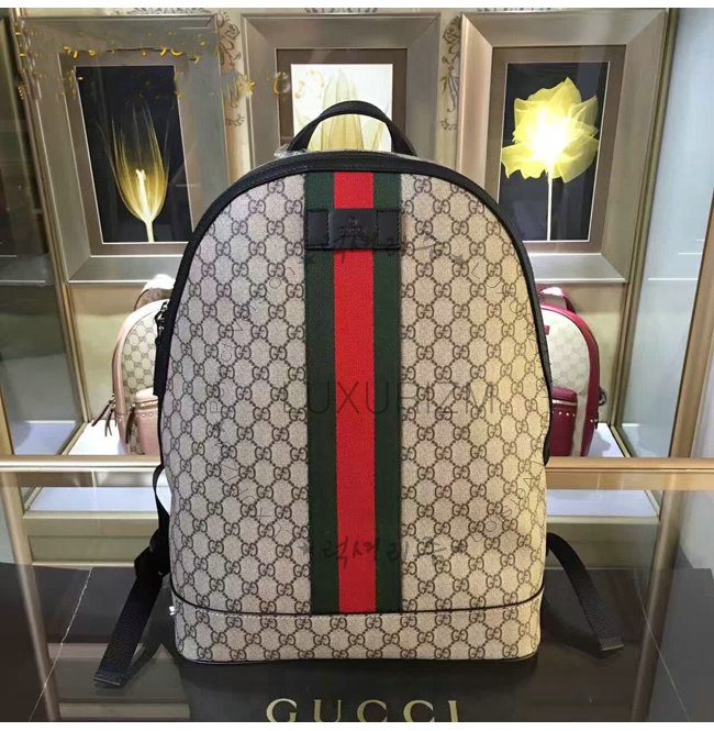 구찌 밴드 GG 수프림 캔버스 백팩 앞면에 Web 장식 및 블랙 가죽 트리밍
