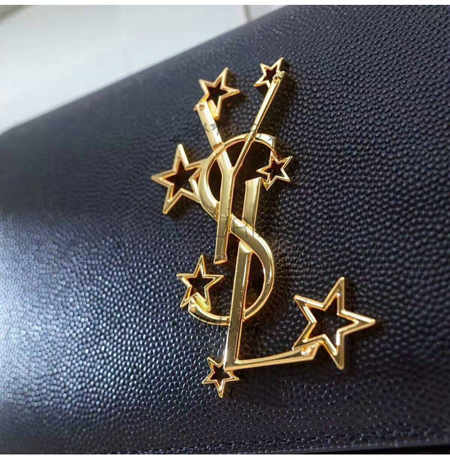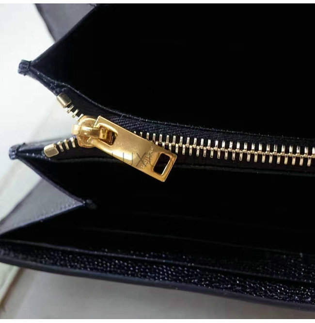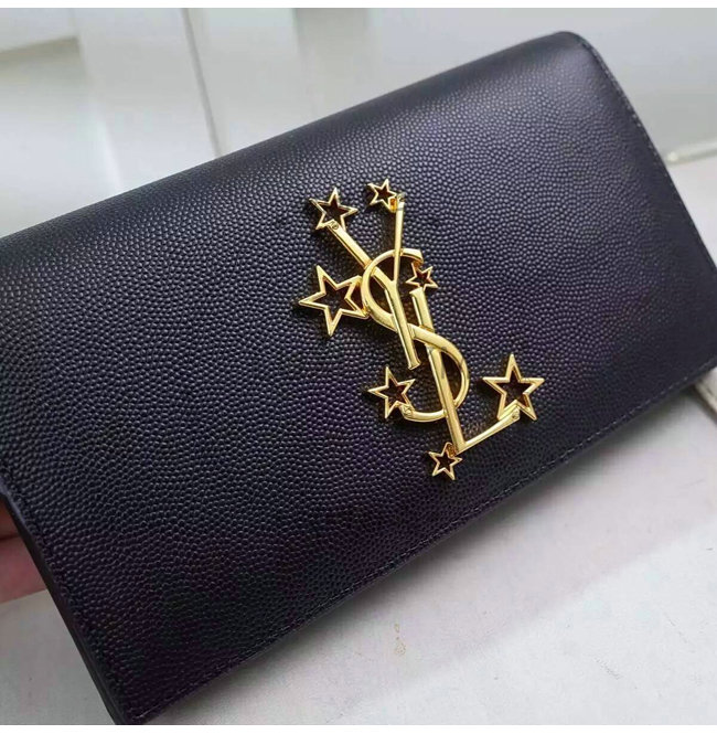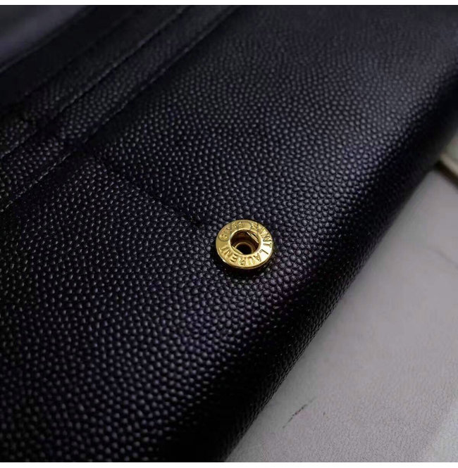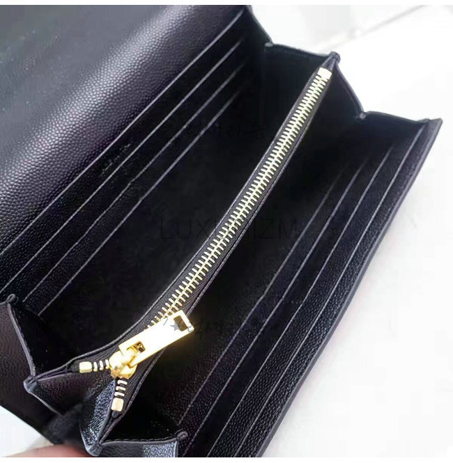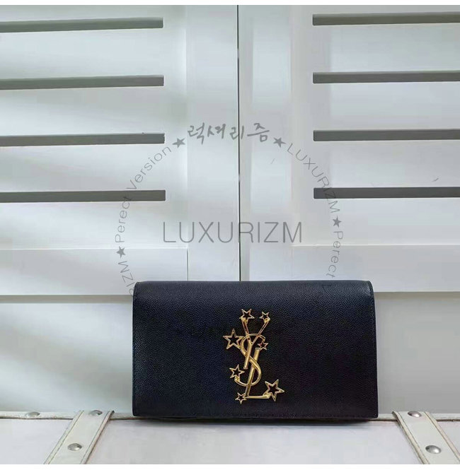 중앙의 골드-톤 메탈 인터로킹 스타 YSL 시그니처 디테일의 라지 지갑.