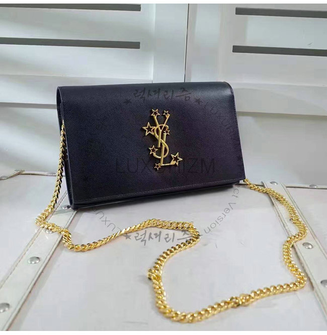 탈부착 가능한 메탈 체인과 메탈 인터로킹 스타 YSL 시그니처 디테일의 클래식 플랩 프론트 지갑.