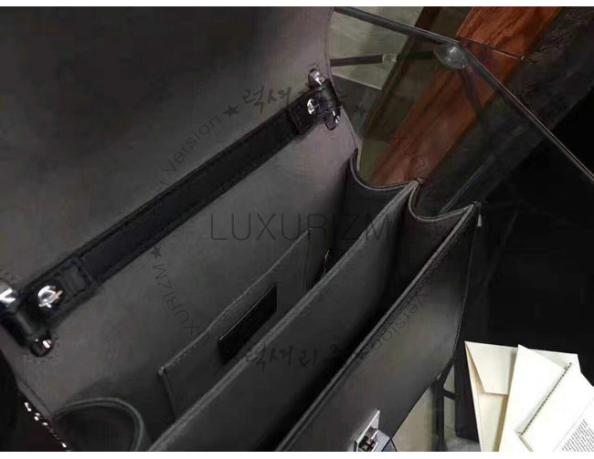 -블랙 컬러의 송아지 가죽 미니백/컴팩트한 내부에 파티션으로 분리되는 거싯 수납 공간1개.